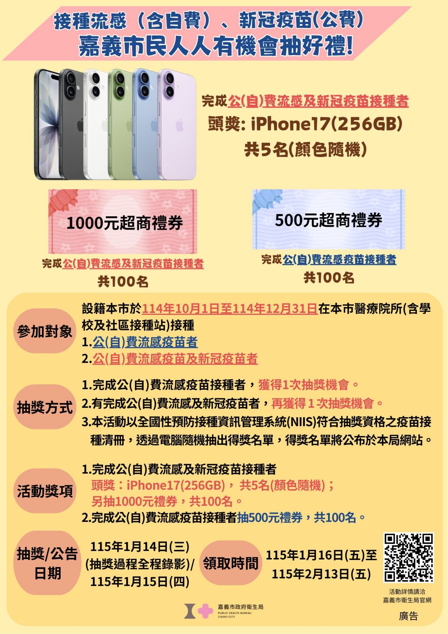 為鼓勵嘉義市市民踴躍接種疫苗,提升自身免疫保護力,嘉義市政府衛生局推出「打疫苗,抽好禮」活動,祭出iPhone 17手機5支,1,000元超商禮券及500元超商禮券各100個名額,本活動以全國性預防接種資訊管理系統(NIIS)符合抽獎資格之疫苗接種清冊,透過電腦隨機抽出得獎名單,抽獎過程全程錄影,得獎名單將公布於嘉義市政府衛生局網站(活動詳情請見宣導單)。