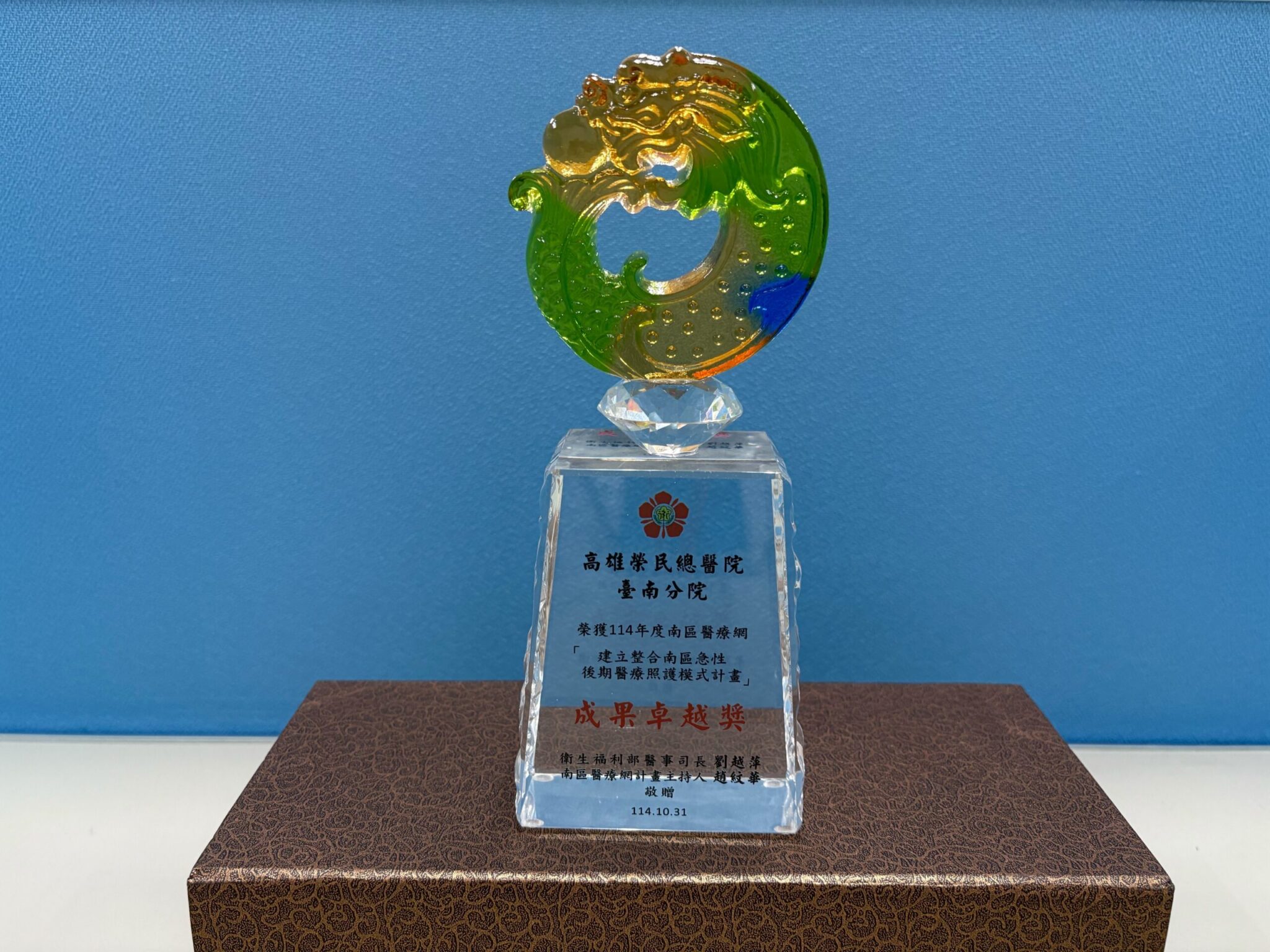 南區醫療網舉辦「114年度南區醫療網-績優醫院頒獎典禮」,高雄榮民總醫院臺南分院以「建立整合南區急性後期醫療照護模式計畫」榮獲「成果卓越獎」,由復健科主治醫師兼主任王一舟代表受獎,展現本院積極推動韌性醫療體系的成果亮點。