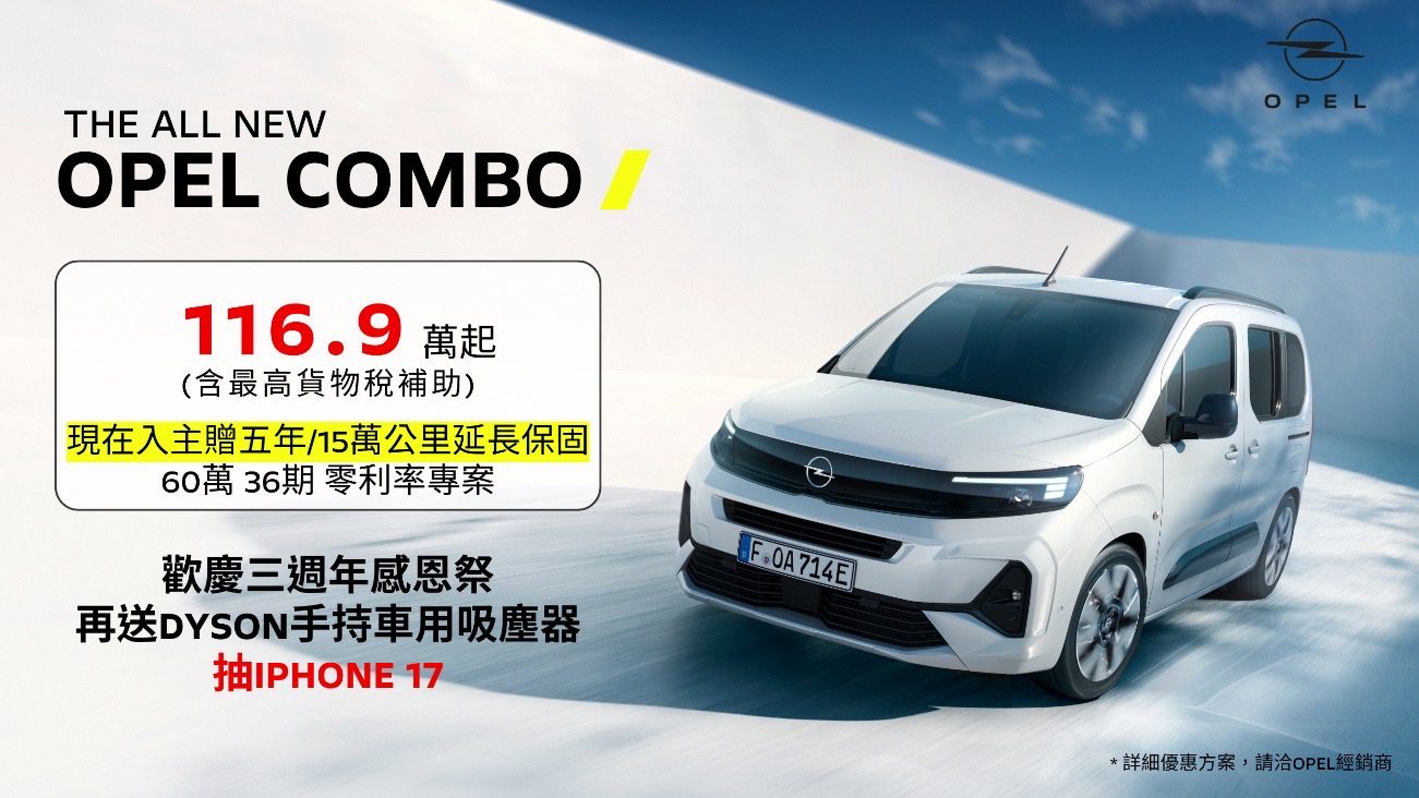 ● 首批OPEL COMBO即將在11月中旬到港,預計11月底交車,於11/5/2025起至2/13/2026三週年感恩祭期間入主COMBO,可享有60萬36期低月付零利率與價值9,900的Dyson手持車用吸塵器,並加贈5年15萬公里延長保固。