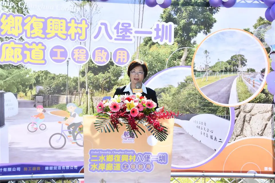 彰化縣政府推動「八堡一圳水岸廊道建置工程」,打通二水鄉復興村廊道斷點,今(5)日舉辦八堡一圳廊道啟用典禮,縣長王惠美與會。王縣長表示,感謝交通部觀光署補助1,512萬元,縣府在議長謝典霖與所有議員的支持下,自籌1,100萬元,總經費達新臺幣2,612萬元。該工程以「硯墨之道」為主題,融合二水石硯產業特色,結合水圳與書法意象,打造兼具休閒與文化風格的踏青新場域,串聯三鐵跑水自行車道及二水鄉觀光自行車道,為地方觀光注入新活力。