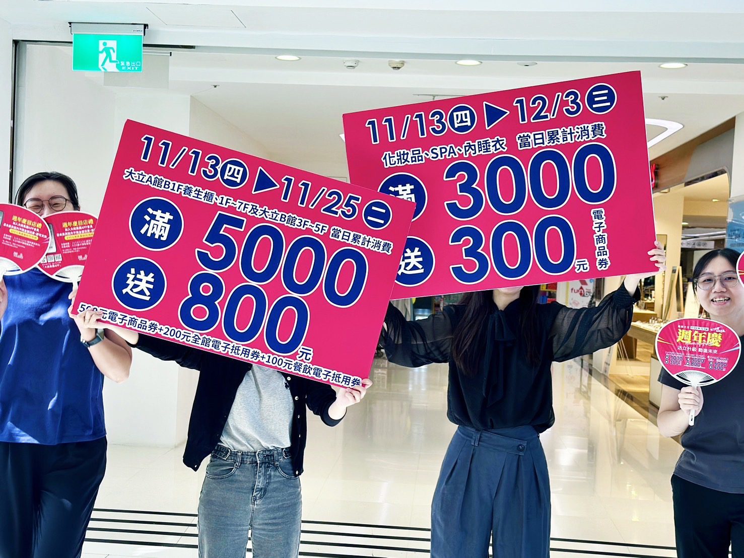 高雄大立年度盛事週年慶正式熱鬧登場!自11月13日至12月3日,大立以滿滿誠意推出多重回饋,全館滿額送好禮、指定櫃位再加碼,讓消費者在年末採購季盡情享受購物樂趣。11月13日至11月25日期間,全館當日消費滿5,000元即可獲得800元;11月13日至12月3日期間,化妝品、SPA、內睡衣等櫃位當日滿3,000元再送300元。11月26日至12月3日刷大統集團聯名卡,滿5,000元即贈500元,層層回饋、誠意滿滿。