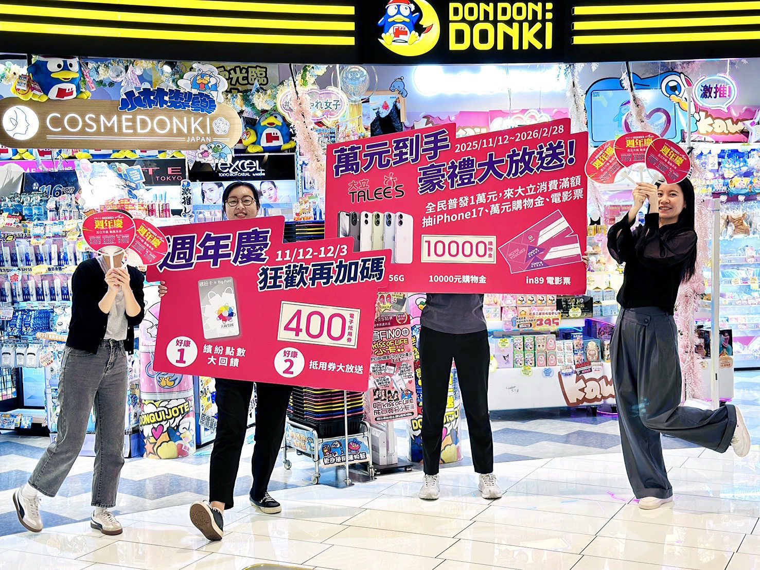 響應政府全民普發一萬元政策,大立同步推出「萬元到手・好禮大放送」活動,即日起至明年2月底,在大立當日消費滿1萬元以上即可參加抽獎,有機會將iPhone 17、萬元購物金及電影票等多項好禮帶回家。活動月月開獎,讓消費者在普發喜悅中享受加倍驚喜。週年慶期間,大立再祭出「繽紛點數大回饋」活動,指定專櫃單日消費滿1萬元以上即可獲得繽紛點數1,000點,MUJI無印良品、TSUTAYA BOOKSTORE、客美多咖啡、2nd Street等品牌及餐廳皆參與本次活動,回饋豐富、好康不間斷。