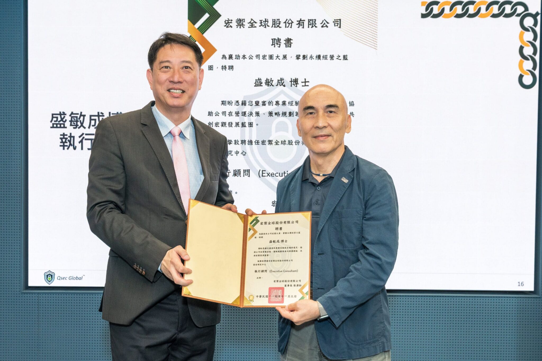 張康齡總經理親自頒授聘書予 盛敏成博士,聘任其為宏禦全球執行顧問,象徵企業在策略布局與技術研究雙向強化的重要一步。