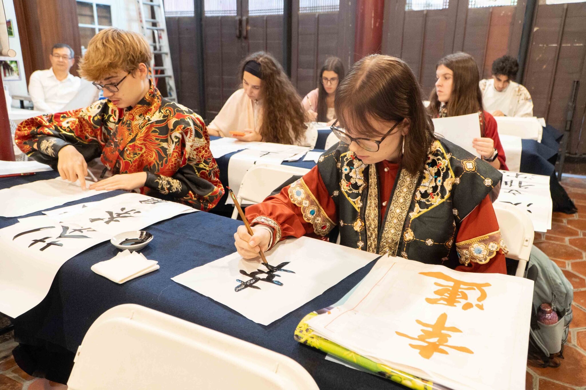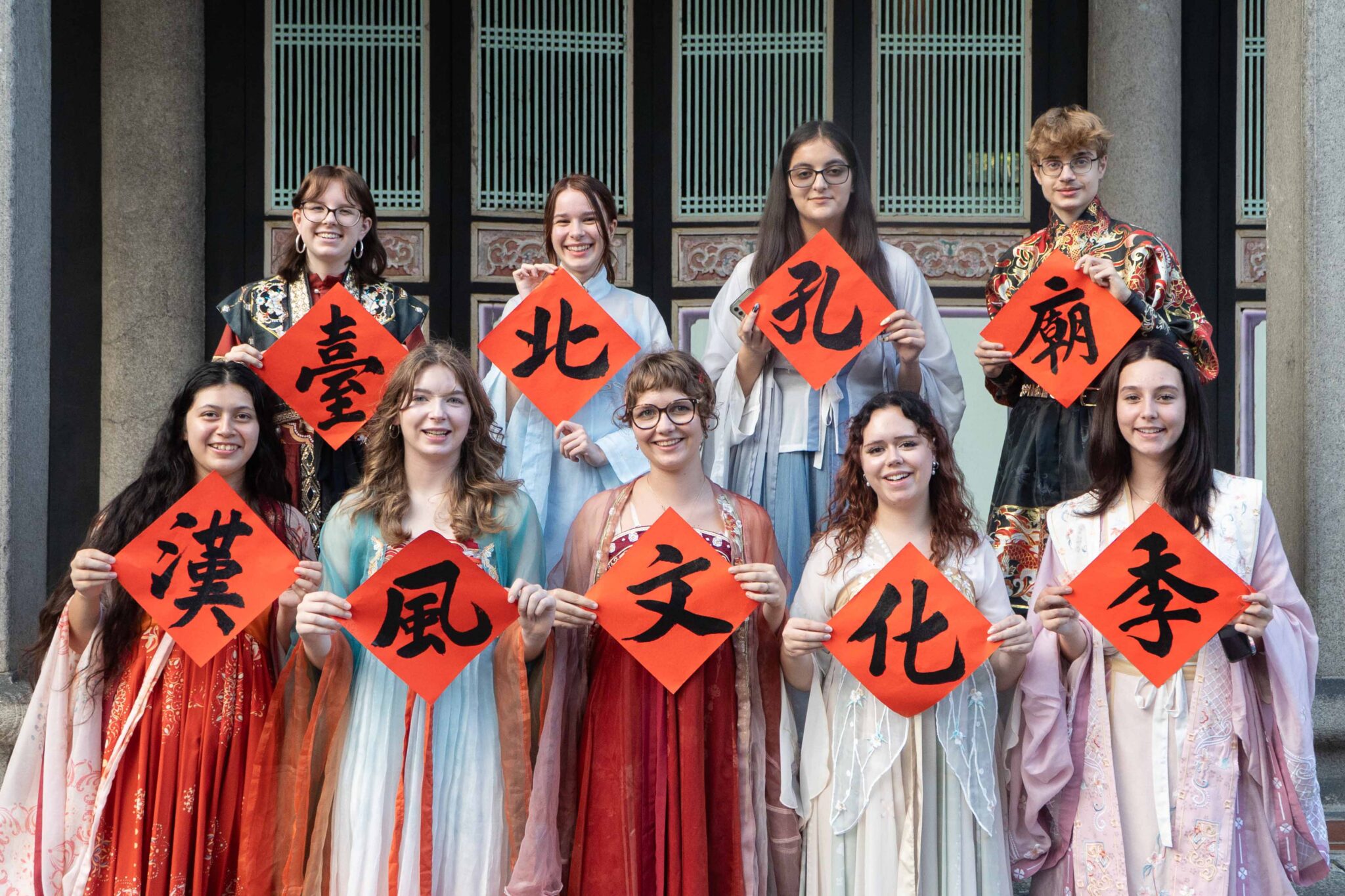 漢風文化季首場活動於11月6日登場,特邀請數十位來自世界各地的外國交換學生穿上漢服,在臺北孔廟親身體驗書法藝術之美,為漢風文化季揭開序幕。身著漢服的外國人,在古意盎然的孔廟建築間揮毫書寫,畫面宛如一場穿越時空的文化對話。從毛筆握法、筆觸運行、筆順書寫到紙張佈局,學員們在沉靜氛圍中領略書法的細膩與深度,不時發出驚嘆:「太有趣了!」許多外國學生表示,這次的體驗不僅讓他們理解書法藝術,更能感受到漢字蘊含的文化精神,以及穿上漢服、提筆寫字的儀式感與優雅氛圍。