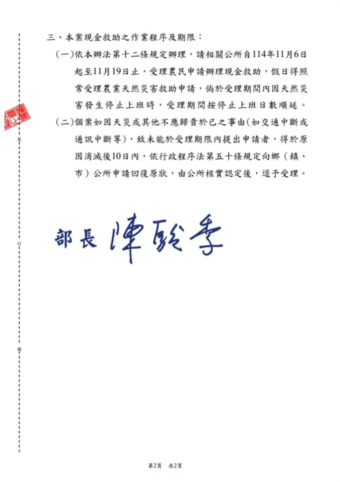 符合規定可申請救助農民朋友,114年11月6日起至11月19日前請儘速持身分證、印章、農會存款簿、土地所有權狀或土地使用同意書及其他應備文件(如三個月內土地登記謄本),向土地所在公所申報。