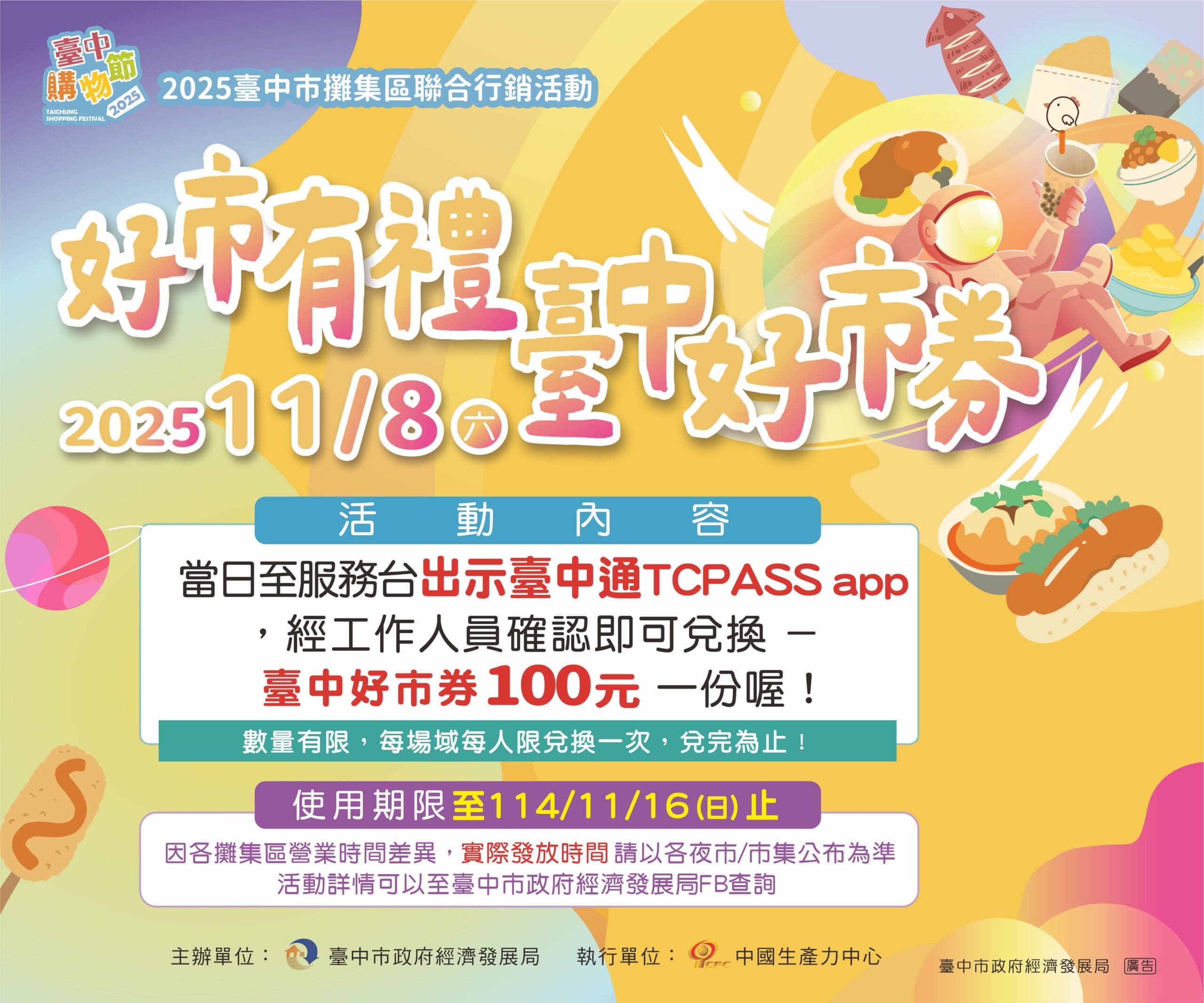 首波登場的「好市有禮 臺中好市券」將於11月8日起登場,民眾只要下載並出示「台中通TCPASS」APP購物節的發票紀錄畫面,即可前往14處夜市與6處市集免費領取100元好市券,總數超過5,000份,每人限兌一份、不可跨區使用,使用期限至11月16日止(日南夜市因營業時間,活動為11月12日辦理)。其參與區域包含逢甲、大甲蔣公路、忠孝路、中華路、旱溪、大慶、清水五權、梧棲中港、大雅雅潭、昌平、長億、捷運(總站)、日南及大坑九號等熱門夜市,以及華美市集、民意街文創市集、金谷市集、梨山水果、干城環保市集及明道花園城等。此外,活動期間在這20處夜市、市集消費,金額還能享有五倍累計抽獎資格,消費越多、中獎機會越高,歡迎大家把購物袋裝滿滿、幸福帶回家!