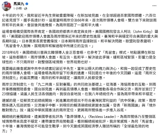 綜合報導/馬習會今天滿10周年,馬英九原定下午出席“馬習會十周年研討會”,馬辦上午表示,馬英九因感冒身體微恙,不克出席,致詞內容改在臉書發文。前總統馬英九表示,馬習會為兩岸搭起了一座和平大橋,備受國際各界肯定。但為何10年後台海情勢從變成英國雜誌《經濟學人》所稱“全球最危險的地方”,他呼籲賴清德總統“懸崖勒馬,回到兩岸共同的政治基礎”。 馬英九基金會與海峽兩岸經貿文化交流協會7日下午共同舉行“馬習會10周年研討會”,國民黨主席鄭麗文將出席。原定馬英九也將出席,但上午馬英九辦公室表示,馬英九“因身體微恙(感冒,醫囑在家休養,也避免傳染給與會貴賓)”,故下午不克出席,所以原定發表的致詞稿改以臉書發文。 馬英九表示,10年前的今天,他和習近平突破重重障礙,在新加坡見面,在全球超過百家國際媒體、600位記者見證下,握手長達81秒。“這是當時兩岸分治66年來,首次兩岸領導人會晤,雙方坐下來對談兩岸和平的未來,會談後共進晚餐,為兩岸搭起了一座和平大橋。” 馬英九說,這場會晤備受國際各界肯定,各國政府都表示肯定與支持。而2018年6月,美國總統特朗普與朝鮮領導人金正恩會晤,也參考了“馬習會”模式,地點選擇在新加坡。“這些都顯示,兩岸領導人會面,有互信、能和平,解決彼此爭端,緩和區域緊張,影響力是全球性的。不只兩岸好,對整個區域情勢,世界局勢也好。” 馬英九也感謝習近平當年以極大的魄力與決心,一起促成了歷史性的兩岸領導人會晤。這場會晤為兩岸留下珍貴的遺產,特別是在十年後的今天回顧,這是“兩岸交流制度化”的最高實踐,兩岸的和平與穩定,讓兩岸人民都受惠。 ![]() 馬英九指出,兩岸交流制度化,在“九二共識,反對台獨”的共同政治基礎上,從海基、海協兩會的互動,到兩岸事務機關陸委會、國台辦見面,再到最高領導人會面,積極推動各項合作與交流。兩岸並簽訂了23個協議,涵蓋人民生活各個面向,“我很自豪地說,在我八年總統任內,曾為兩岸帶來和平穩定。” 馬英九也提到,從蔡英文開始,民進黨政府提出不符合台灣民眾利益的“抗中保台”政策,兩岸關係邁入低迷狀態,交流幾乎中斷。到賴清德更變本加厲,發表“新兩國論”與“境外敵對勢力”說,違反中華民國憲法的兩岸定位,更將兩岸關係進一步推入谷底。