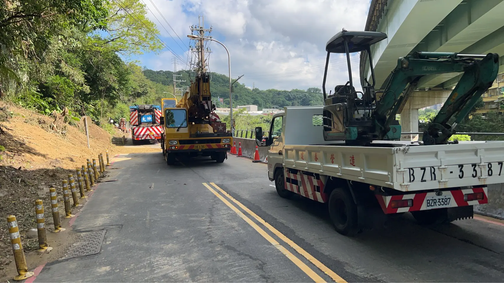 工務處土木工程科長張佑竹表示,該處並非歷史性災害邊坡,惟現場約40公尺高處仍有多顆大小不等巨石懸置,具有掉落風險。為降低危害,調集130、50及20噸吊車3台及50、30、17型挖土機(含破碎機)3台協同吊掛作業,使用破碎機進行岩塊裂解作業,再行分批清運處理。由於現場作業高度及風險均高,為確保施工人員與用路人安全,工務處已決定持續封閉該路段,待完成清除後,評估確認安全無虞再行開放。
