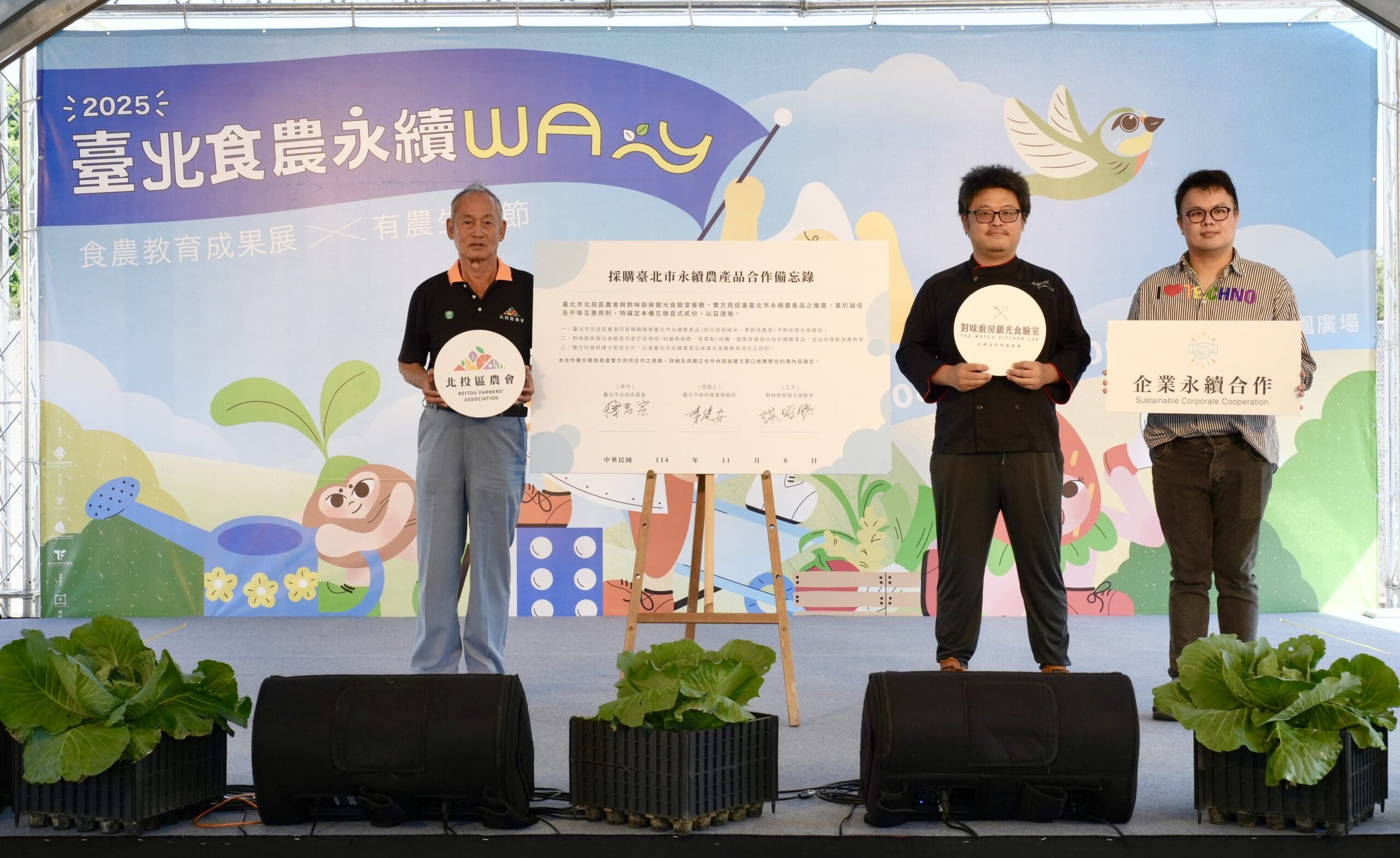 開幕活動舉行企業永續合作簽署及食農教育教案競賽頒獎兩大儀式,展現臺北市推動永續農業與深化食農教育的雙重成果。由北投農會與對味銀光食驗室共同簽署企業永續合作備忘錄(MOU),產業局擔任見證人,攜手推動「在地食材、銀髮友善、永續飲食」,實踐友善耕作與永續飲食的理念。