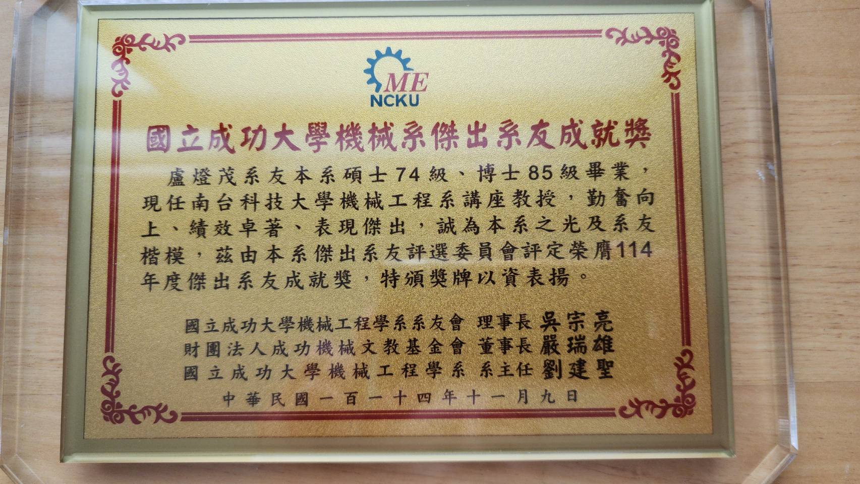 ▲盧燈茂榮膺教育部資深優良教師獎、成功大學機械工程系傑出系友獎,雙獎臨門。