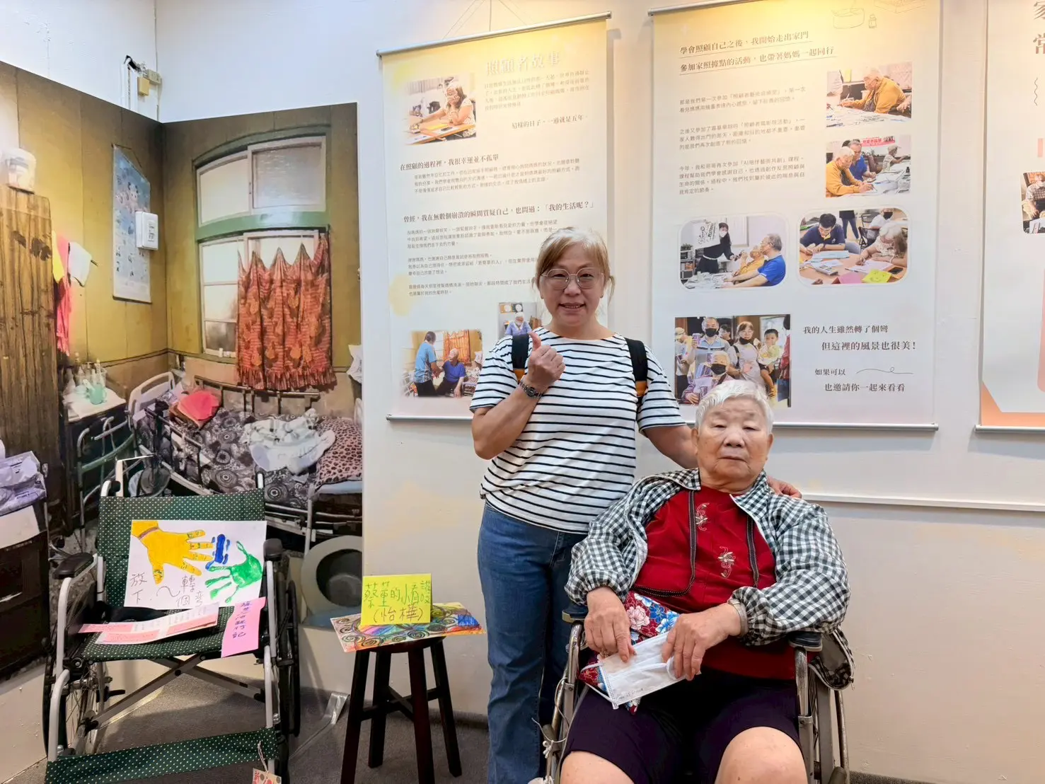 展覽也特別選在11月「家庭照顧者關懷月」登場,呼應嘉基為愛多走一里路的關懷精神。照顧者陳小姐分享,照顧媽媽多年,曾以為能一肩扛起所有事,但沒日沒夜地照顧需求,身心俱疲,直到居服員每日上門協助,成了喘口氣的小確幸,能參加照顧者課程與藝術活動,才明白身為照顧者的自己也需要被照顧,逐漸讓她學會放下焦慮,重新找回生活的節奏。