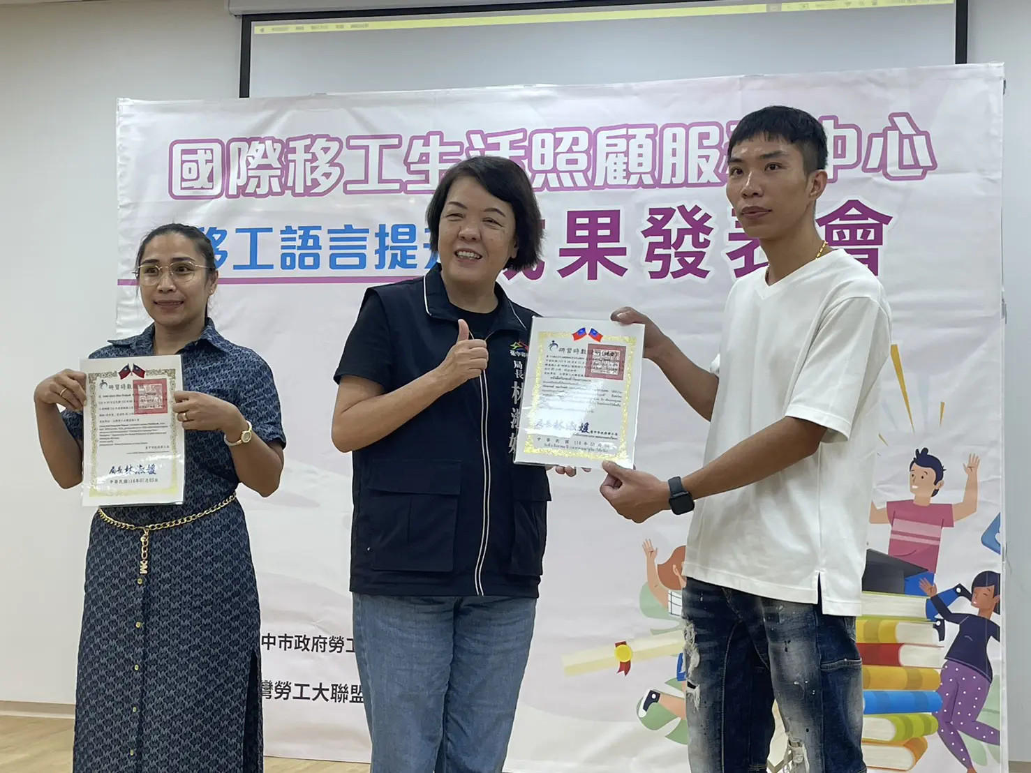 林局長進一步指出,考量台中市家事類移工主要照護對象多為慣用台語的長輩,勞工局自110年起開辦台語課程,深受雇主與移工好評。許多學員反映,學習台語不僅有助於提升照護工作的溝通效率,也讓他們更能融入在地生活。今年更有8名印尼籍學員於結訓後順利通過華語能力證照考試,展現優異學習成果與積極進修的熱忱,充分體現台中市推動移工語言培訓的成效。