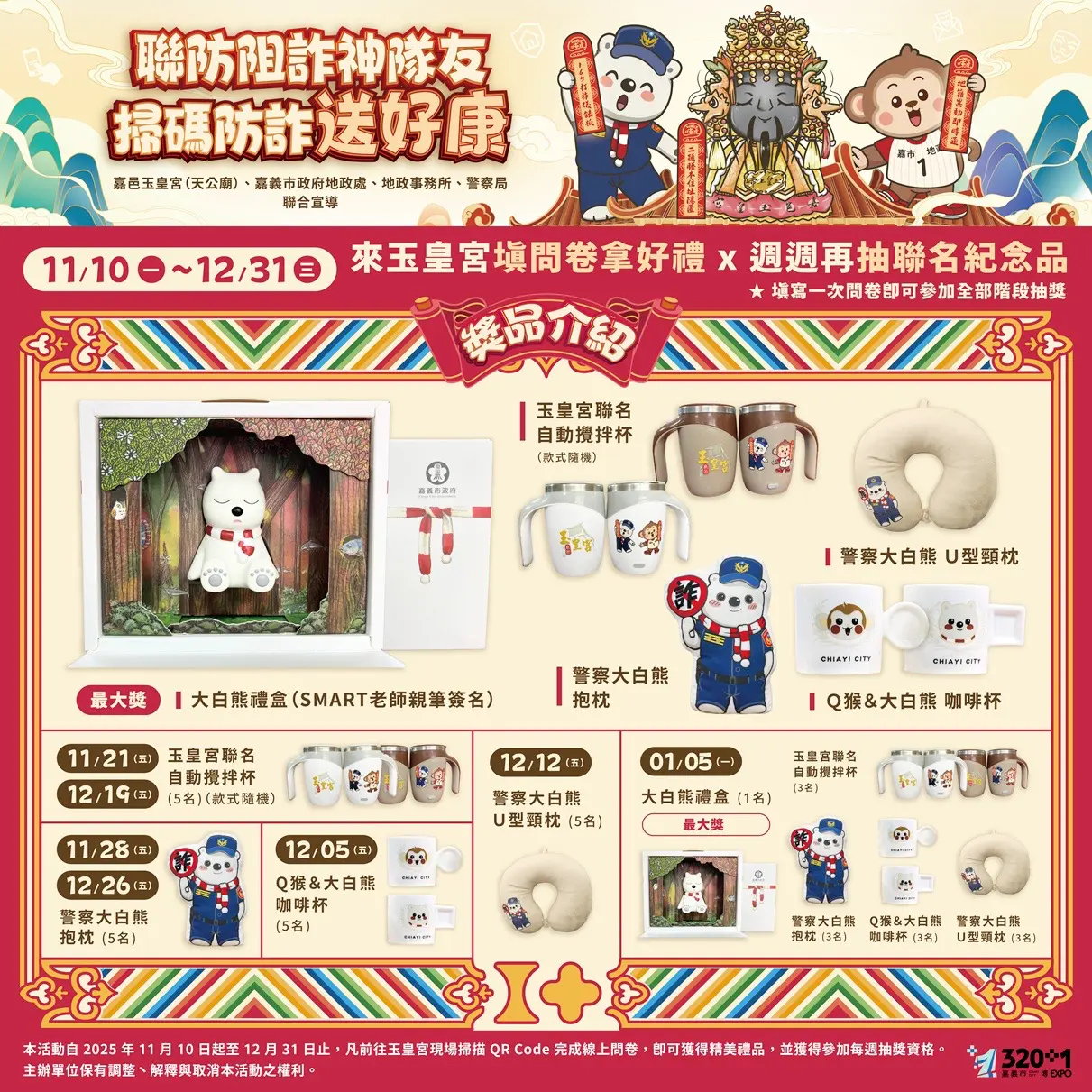 為強化全民防詐意識,自114年11月10日起至114年12月31日止,來嘉邑玉皇宮完成線上防詐問卷,即可兌換精美小禮物之外,週週再抽聯名限定紀念品,活動詳情與抽獎公告請詳見 嘉邑玉皇宮(天公廟)、Q猴 地政了、嘉義市政府警察局 臉書粉絲專頁。