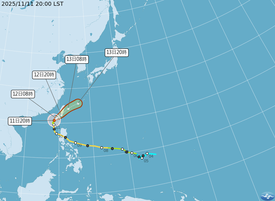 暴風圈預計12日清晨觸碰屏東陸地,下午抵達西南方近海,傍晚至晚間從高屏登陸,其中又以屏東機率較大,並於當日深夜至隔日清晨從花東出海,目前預估從臺東出海機率較大,並於週四解除海上陸上颱風警報。