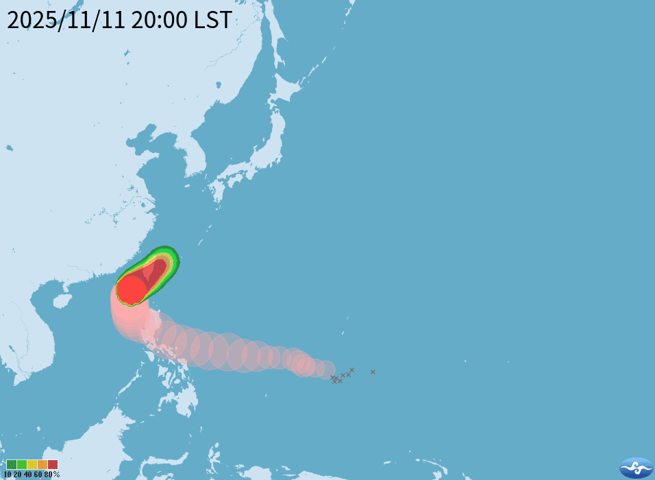 氣象署發布豪(大)雨特報,颱風及其外圍環流及東北季風影響,易有短延時強降雨,11日晚至12日宜蘭縣地區及北海岸有局部大豪雨或超大豪雨,基隆市地區、新北市地區、臺東縣山區、臺北市山區、桃園市山區、花蓮縣山區及屏東縣山區有局部大雨或豪雨,臺北地區及高雄、屏東及澎湖地區有局部大雨發生的機率,山區請嚴防坍方、落石、土石流及山洪暴發,低窪地區請慎防積淹水。超大豪雨地區:新北市、宜蘭縣。