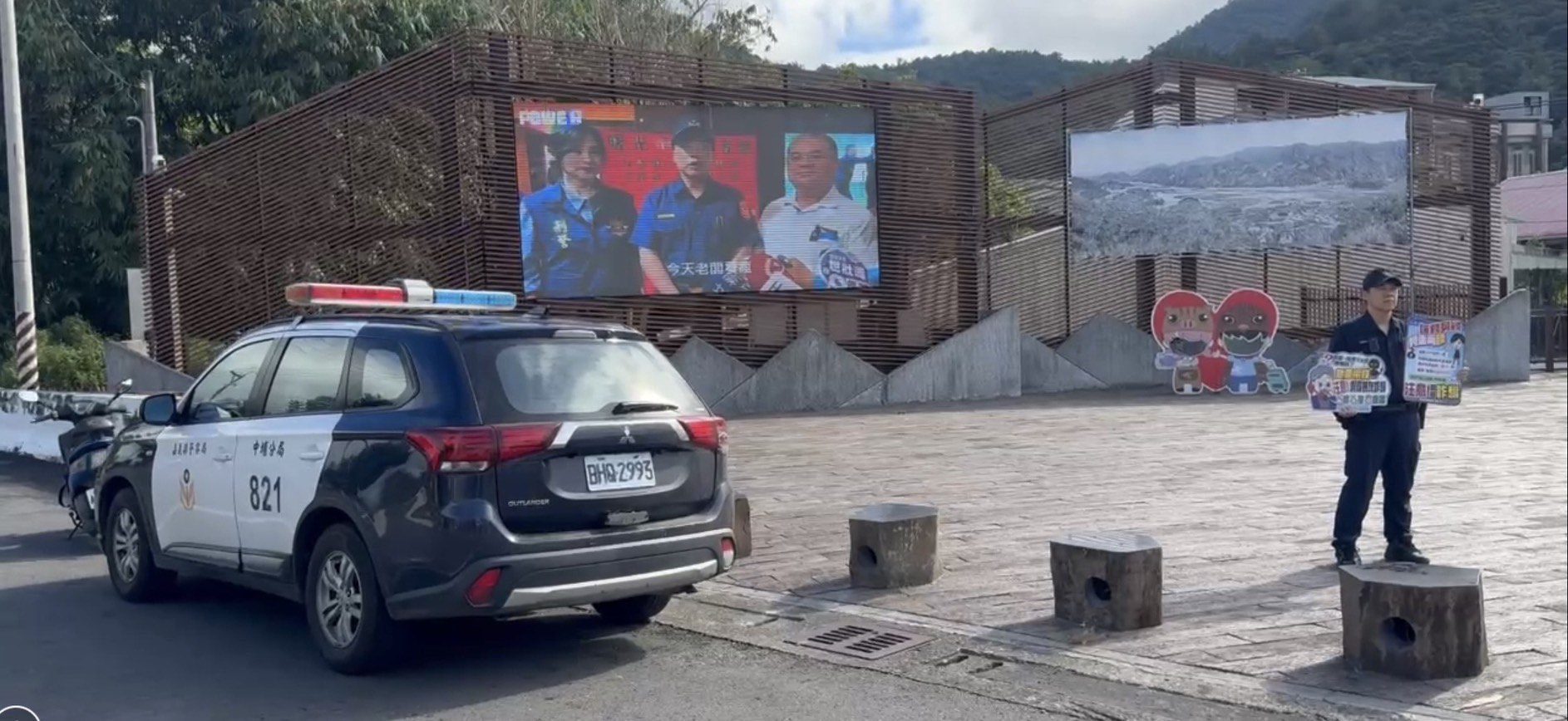 中埔分局長曾裕景因應政府普發現金政策,面對詐騙集團藉機羅織詐騙話術,特別以夜市叫賣哥錄製反詐騙音檔,透過電視牆及現場員警手持反詐騙標語向民眾宣導。