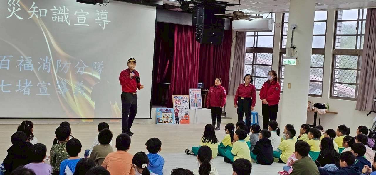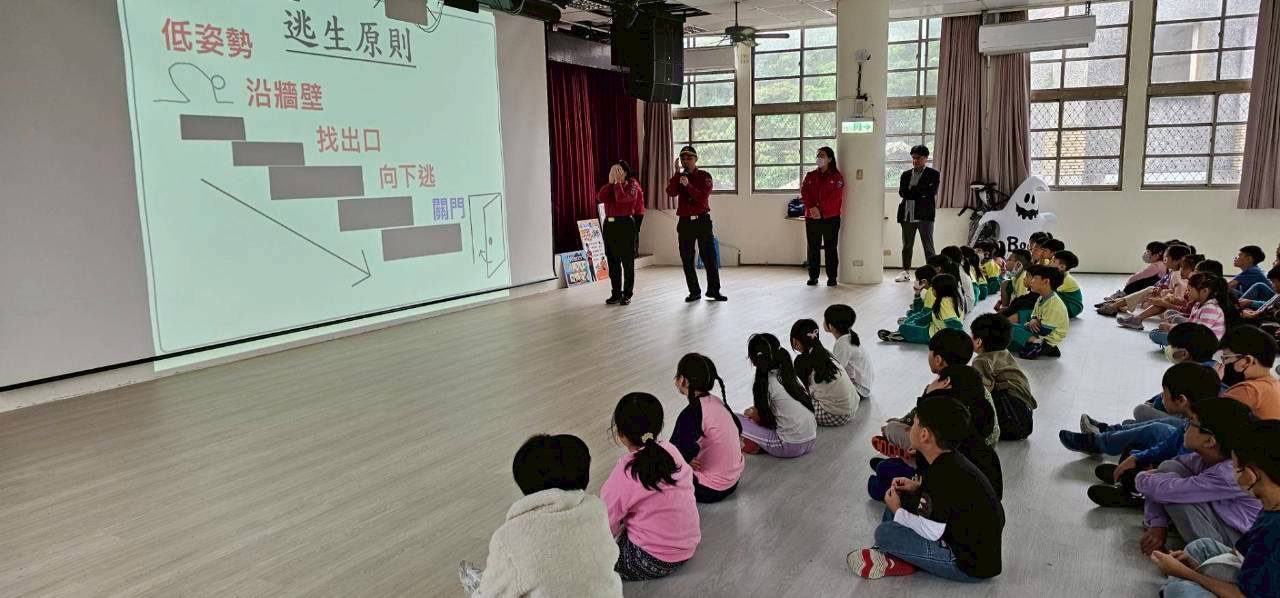 為強化校園防災教育、提升學童面對災害時的自我保護能力,基隆市消防局百福分隊11月13日與義消七堵宣導分隊姊妹攜手,一起前往華興國小舉辦「防火小學堂」宣導活動。透過災害情境示範與師生互動,讓學生建立正確的防火觀念及逃生觀念。