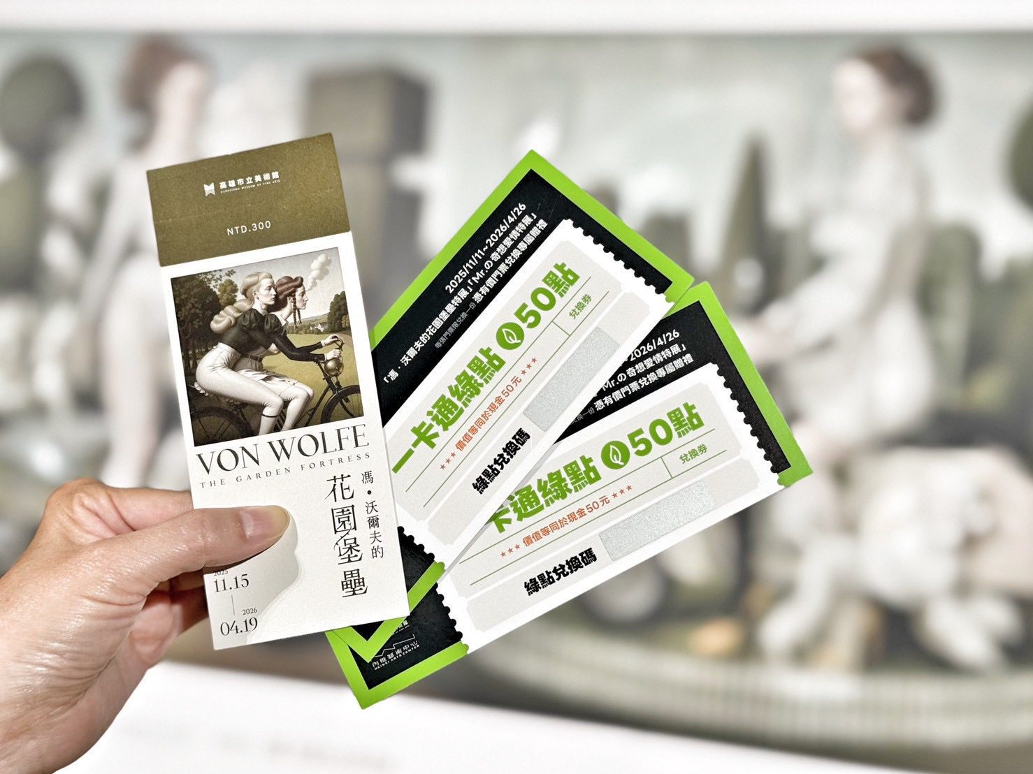 愛護地球即刻行動, iPASS一卡通與高美館攜手鼓勵民眾支持本次「藝術低碳永續行動」,改搭乘大眾運輸前往欣賞國際級藝術特展,自2025年11月11日起,於《馮.沃爾夫的花園堡壘》及《Mr.の奇想愛情》特展期間,憑兩特展有價門票可分別至高雄市立美術館1F服務中心及內惟藝術中心服務櫃台,每人每張門票可兌換「一卡通綠點50點」兌換券乙張,每iPASSMONEY帳號限領兩組序號,數量有限,兌完為止。一卡通綠點1點價值等於1元,可折抵一卡通記名卡及iPASS MONEY乘車碼交通搭乘金、生活繳費或超商綠色通路消費,請民眾多改搭乘大眾運輸前往觀展,支持藝術低碳永續行動。