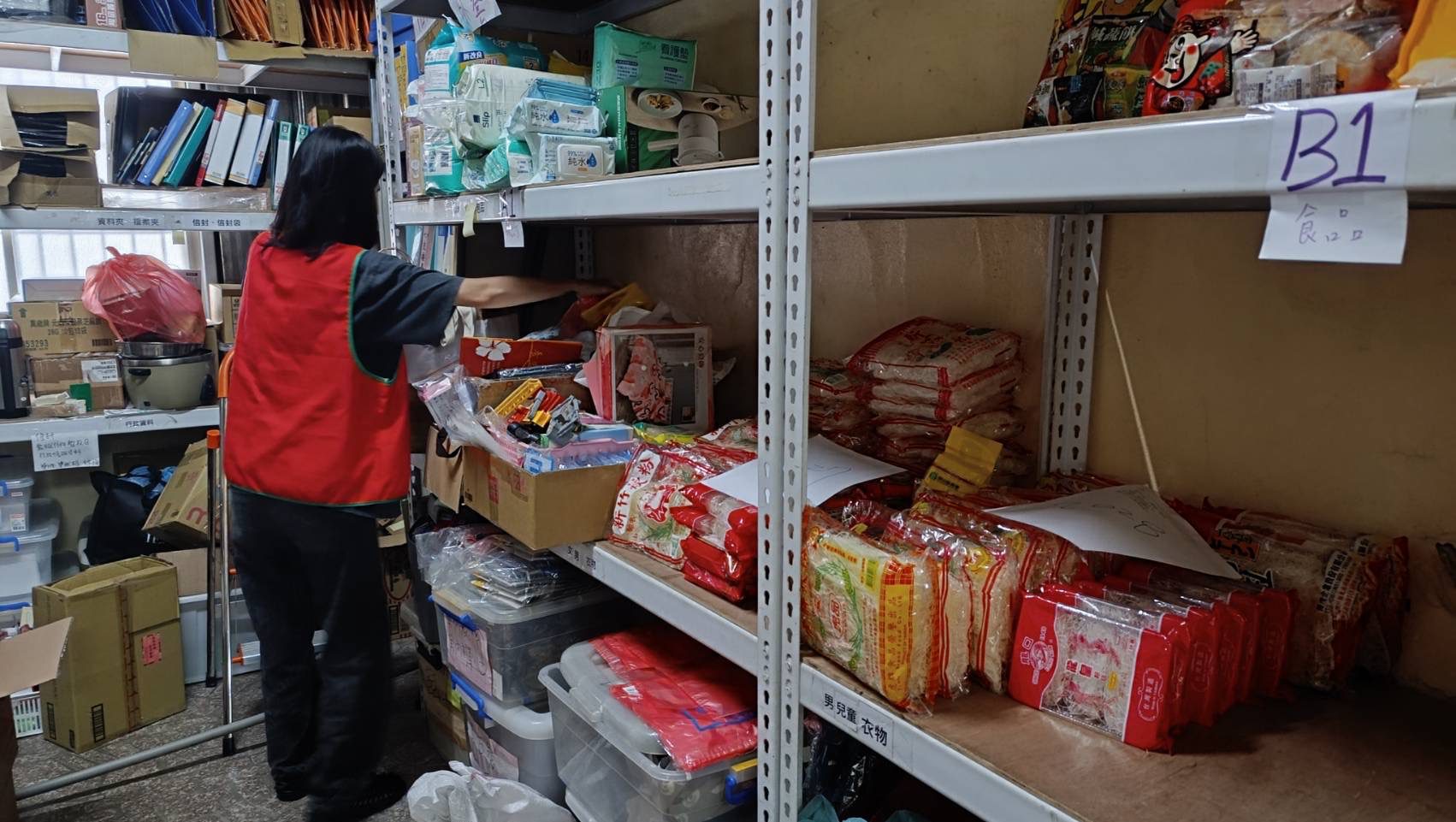 志工們彎著腰搬箱、整理、記錄,汗浸透了紅色背心,卻沒人喊苦。