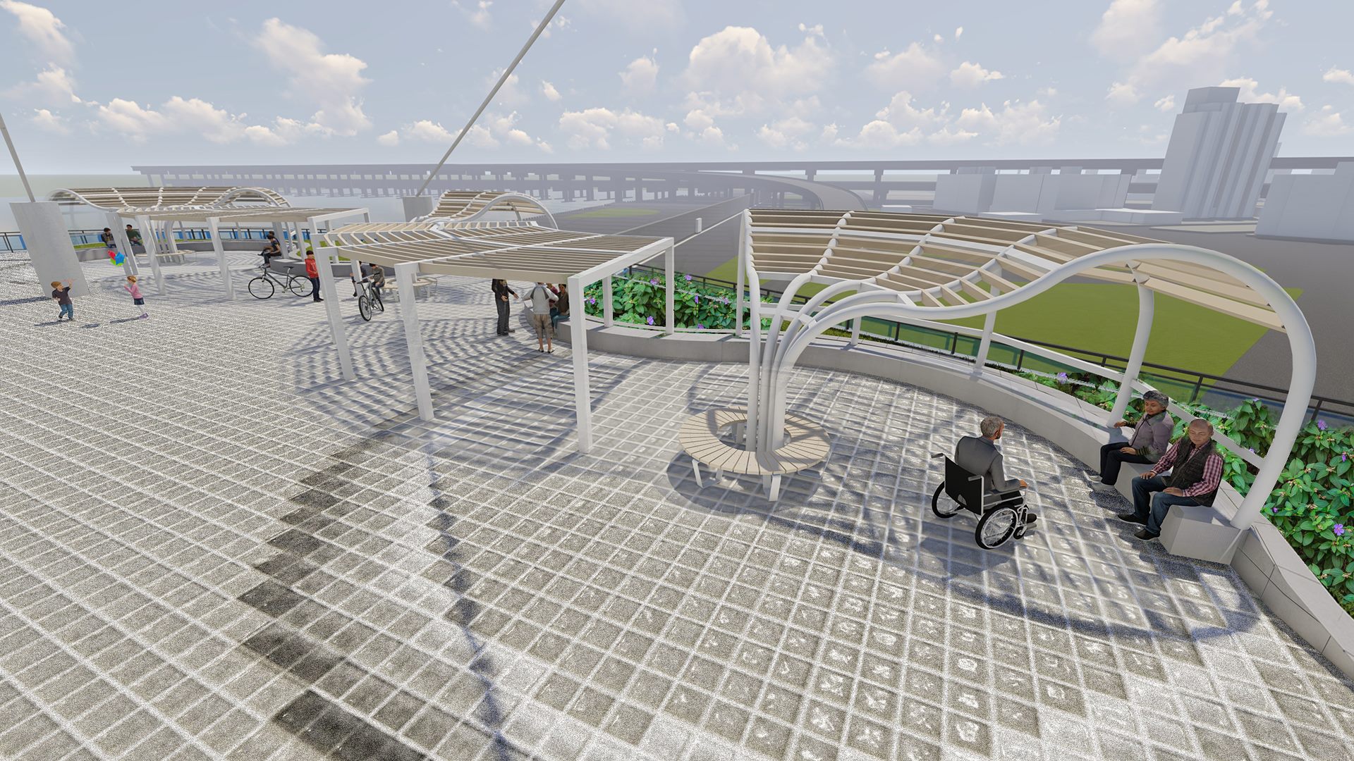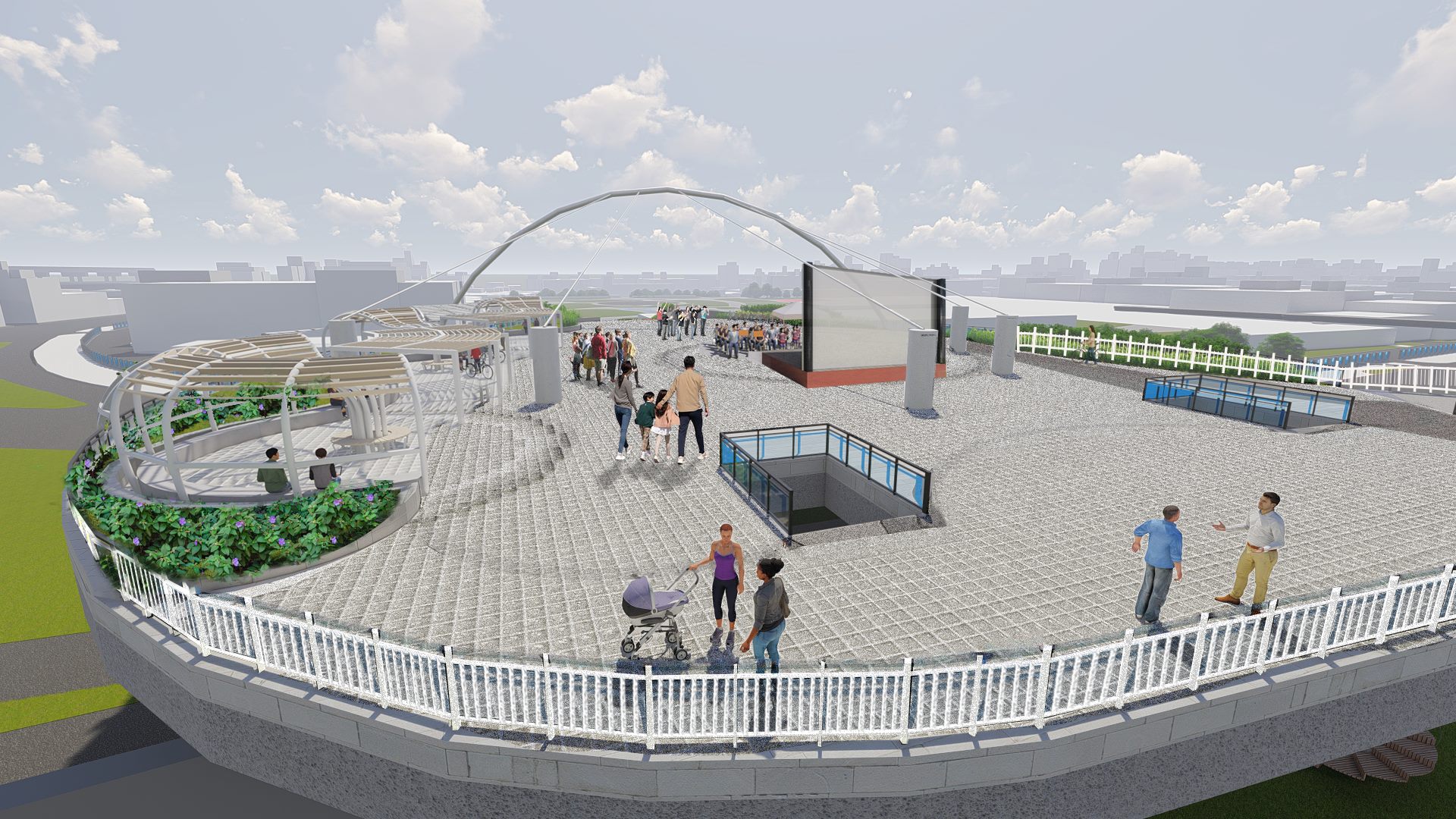衛工處長黃群說,迪化污水處理廠附設休閒運動公園占地約4.3公頃,為改善河濱公園與堤內的人行與自行車動線,並吸引更多自行車族於行經淡水河敦煌碼頭段時,能方便從休閒運動公園延伸至北大同的老師府、孔廟、保安宮及迪化街等地,感受大龍峒及大稻埕獨特的文化魅力。本工程將利用鋼構橋串聯公園既有已延伸至堤外的景觀平台,與相距80公尺的公共藝術陸橋「大地重現」,打造3至6公尺寬的自行車牽引道,讓自行車騎士可輕鬆推車進出。