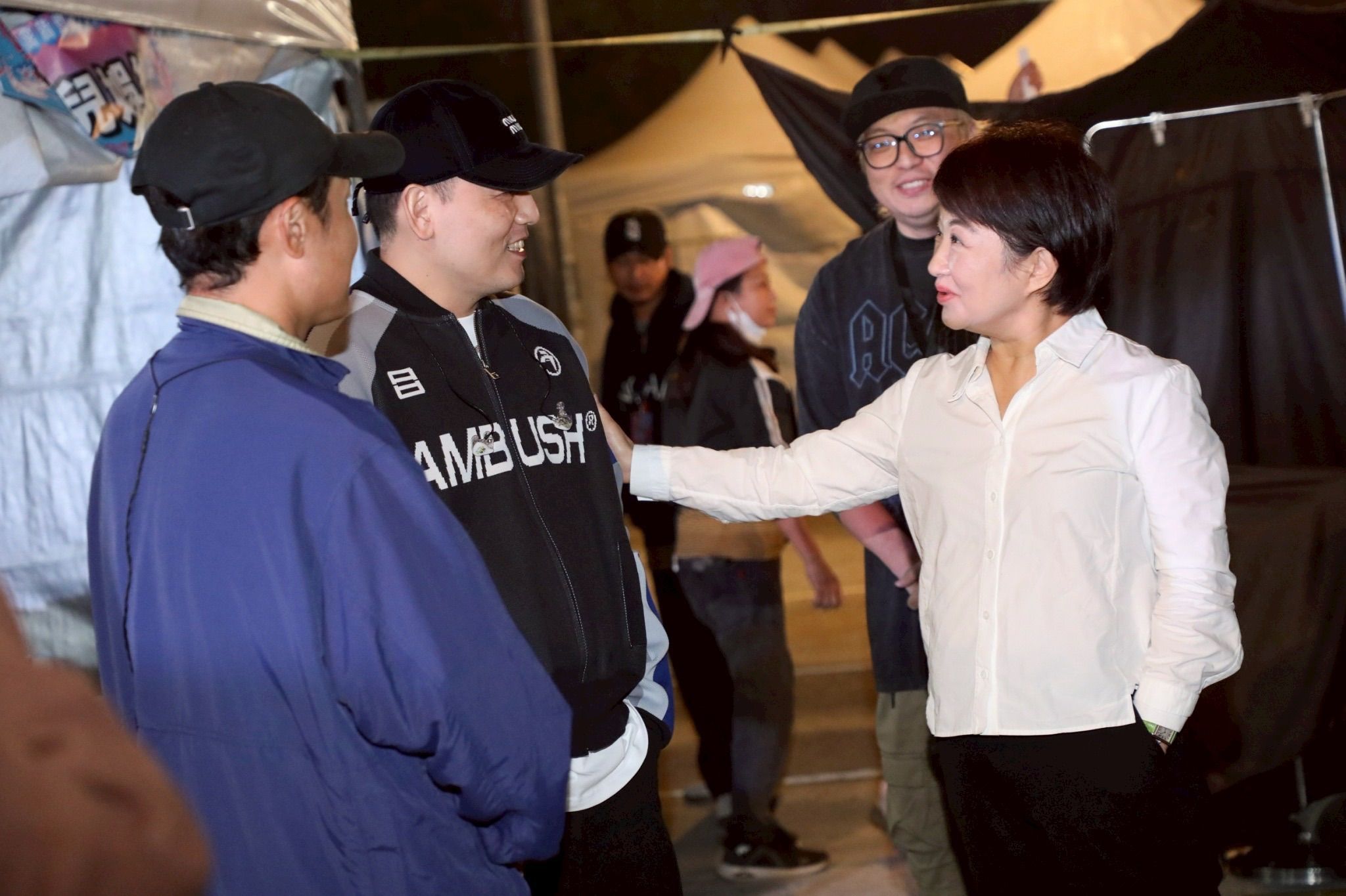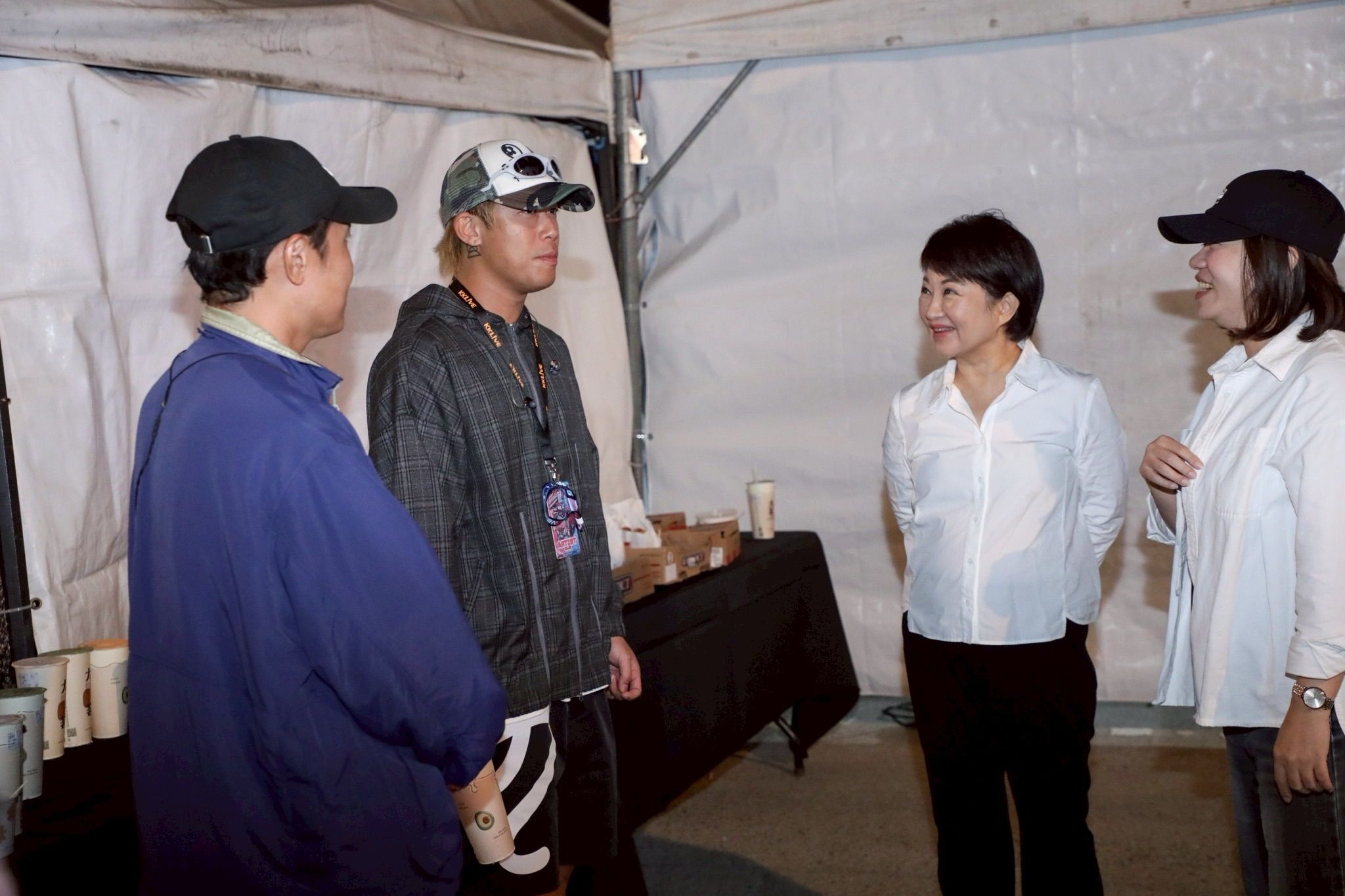 台中市長盧秀燕昨晚親赴中央公園「玖壹壹南北貳路音樂節2025」彩排現場探班,祝福演出圓滿成功