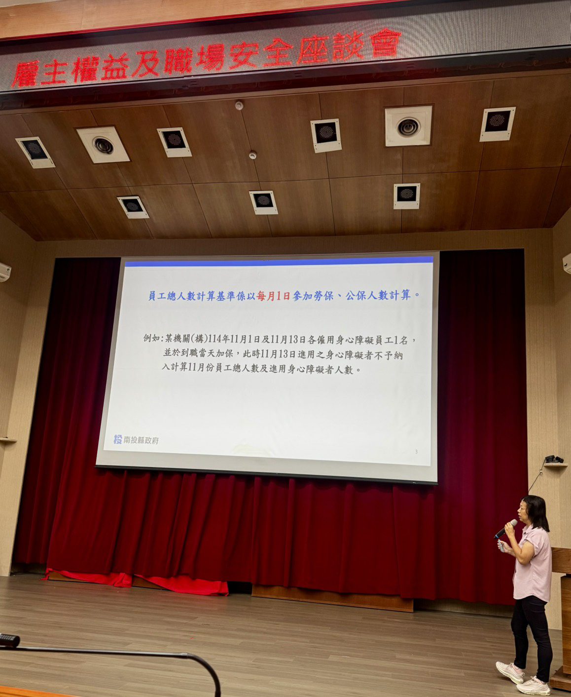為增加各事業單位對「身心障礙者權益保障法」及政府單位提供勞工安定協助措施的認識,南投縣政府社會及勞動局13日在縣府7樓國際會議廳舉辦「雇主權益及職場安全座談會」,協助雇主瞭解最新政策動向與勞工安全管理趨勢。