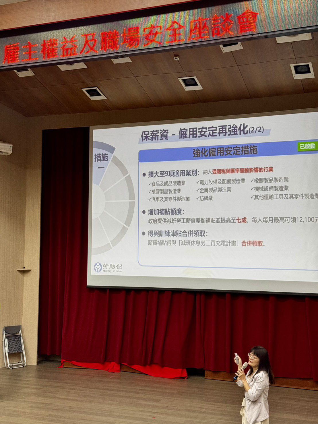 本次座談會課程內容豐富,包含「因應國際情勢支持勞工安定就業協助措施」、「職務再設計服務介紹」、「身心障礙者就業權益保障法-定額進用法規」、「身心障礙者職業重建服務介紹」、「工廠安全智慧AI防災平台」等主題,內容兼具政策宣導與實務應用。