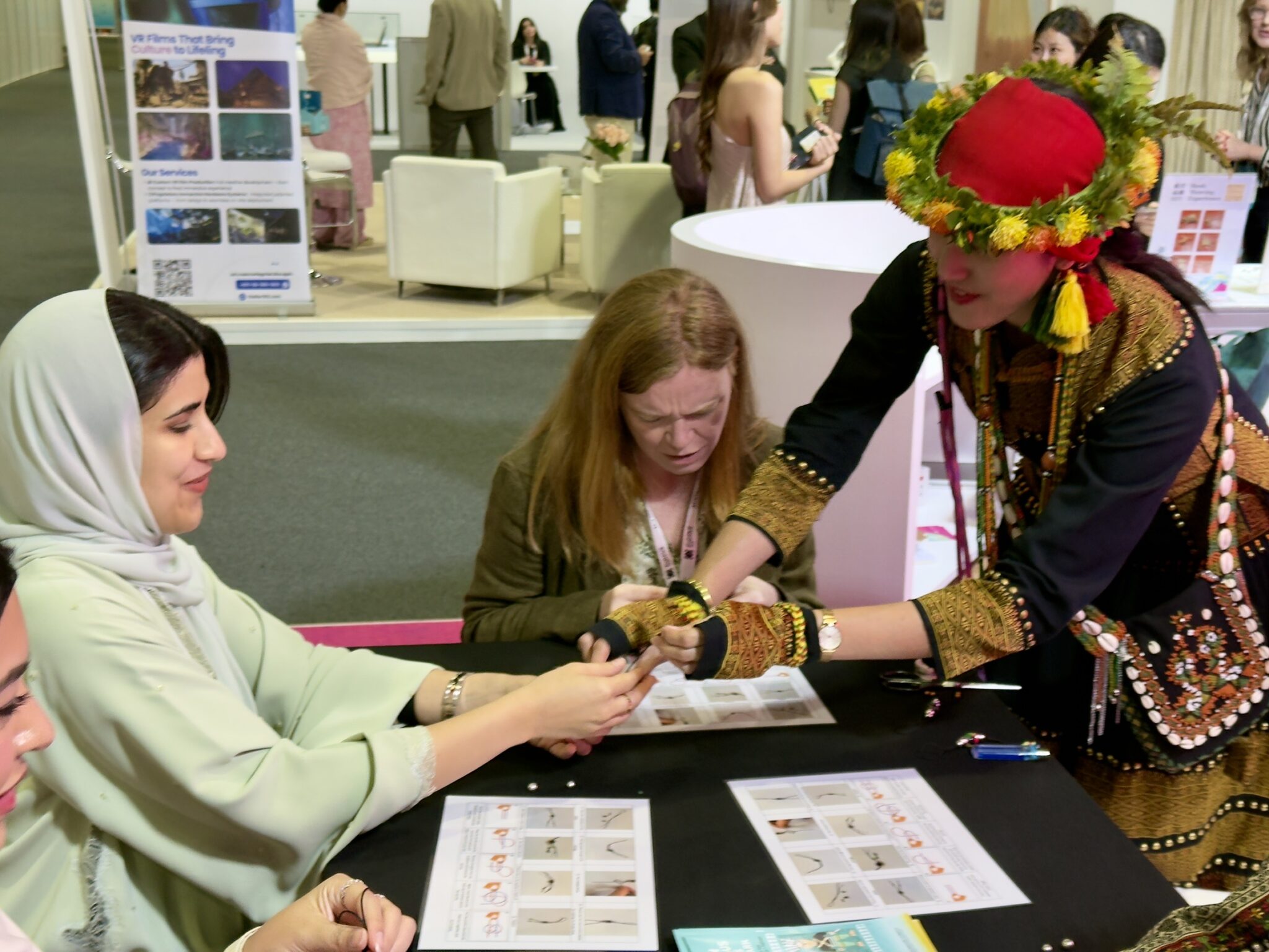 圖説:圖片五、國立原住民族博物館籌備處於杜拜大會中講解排灣族琉璃珠文化,並提供串珠體驗,現場嘉賓踴躍參與,氣氛相當熱烈。(原民會提供)