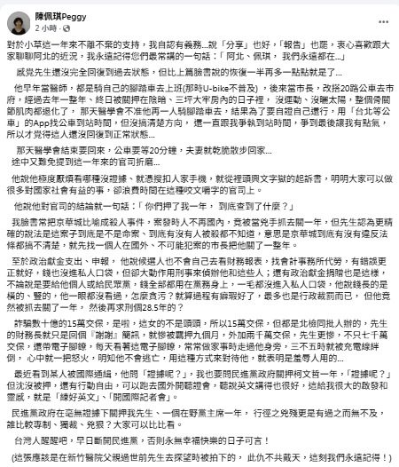 陳佩琪14日在臉書發文感謝,對於小草這一年來不離不棄的支持,自認有義務分享或報告柯文哲的近況。她說,永遠記得小草們最常講的一句話:“阿北、佩琪,我們永遠都在…”。感覺柯文哲還沒完全回復到過去狀態,但比上篇臉書說的恢復一半再多一點點就是了。