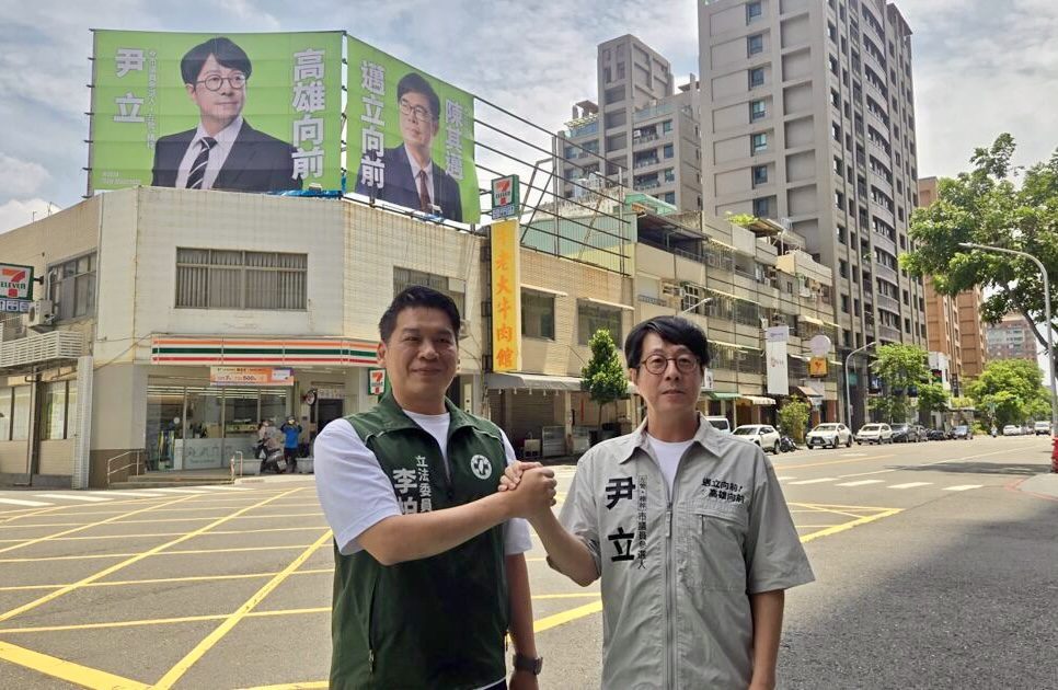 罷韓四公子,尹立;於宣布參選時由民進黨現任立立委,李柏毅陪同,在看板前合影