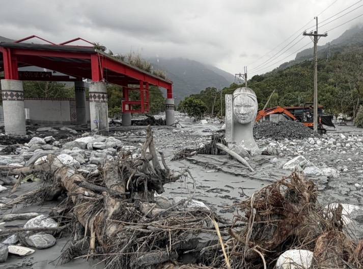 巨大的紋面阿嬤雕像已從泥濘中脫困,雖然周邊環境仍堆滿土石、災後景象猶在,但雕像莊嚴慈祥的面容已清晰可見,彷彿默默守護著歷經風災的部落。