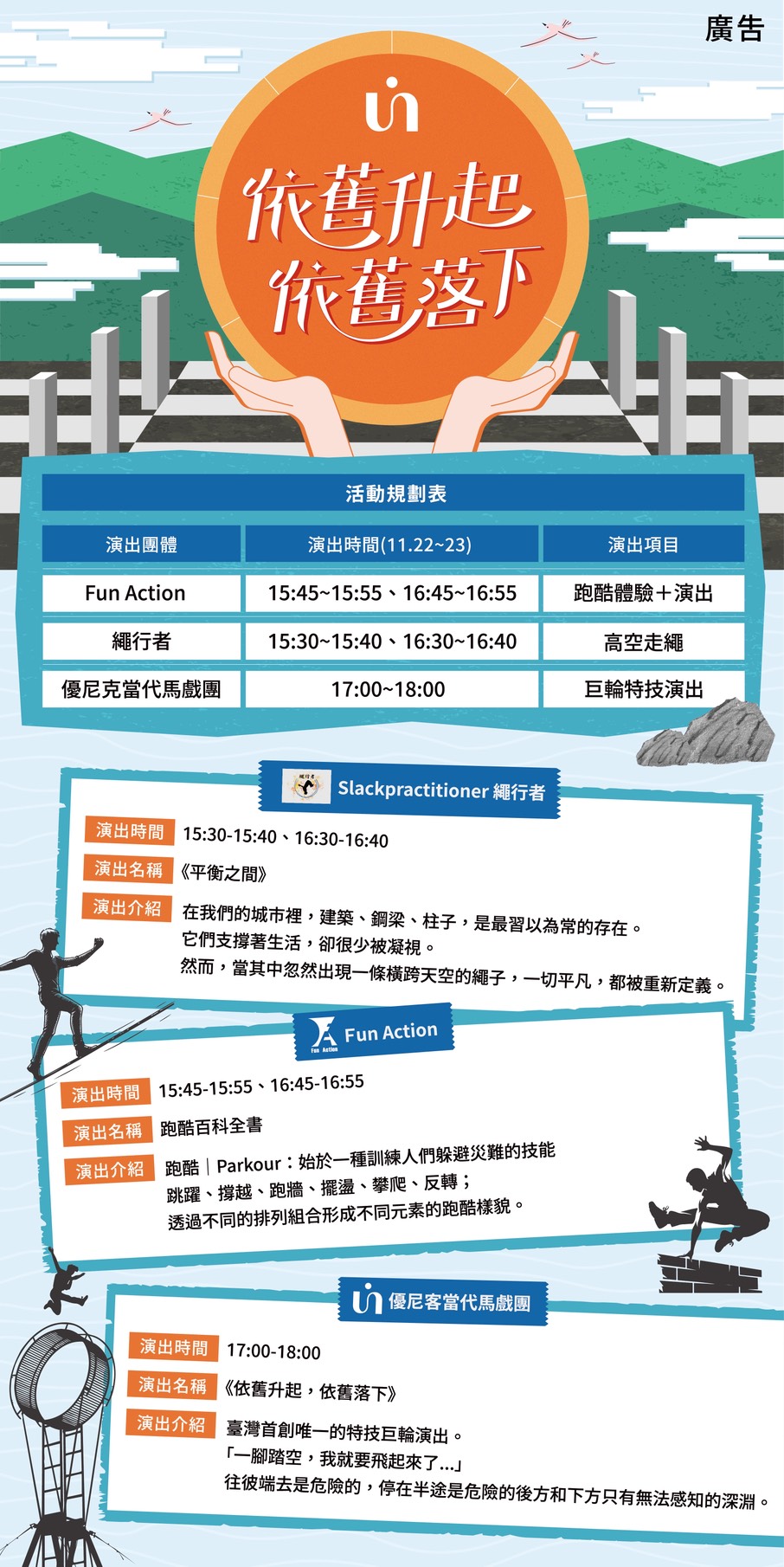 活動期間,觀眾可在日出大道近距離感受表演者的力量與專注。跑酷體驗與演出《跑酷百科全書》、結合特技與籃球的《蹦床籃球》,以及高空走繩作品《平衡之間》,都將輪番登場。壓軸節目則由Uni優尼克當代馬戲團帶來巨輪演出《依舊升起,依舊落下》,以十公尺高的巨輪為主要裝置,結合高難度肢體動作與詩意意象,象徵人類面對未知的勇氣與前進的意志。