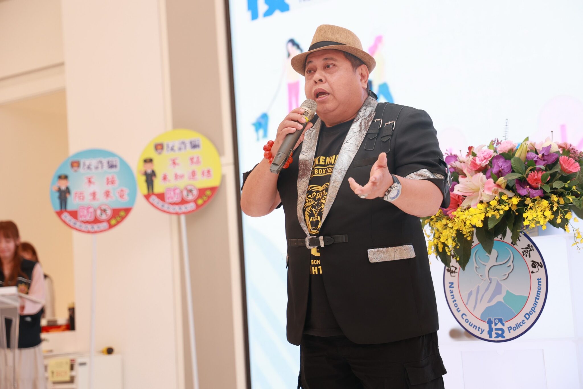 南投縣政府警察局18日下午在半山夢工廠,舉辦反詐記者會,縣議員林儒暘,各宮廟及團體參加外,藝人黑面也擔任反詐騙的代言人,盼全民提高反詐意識。