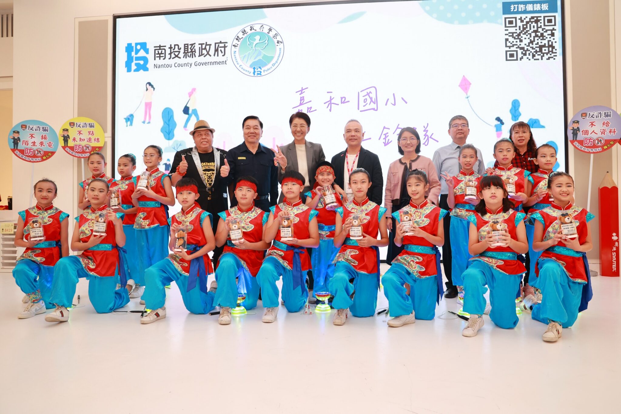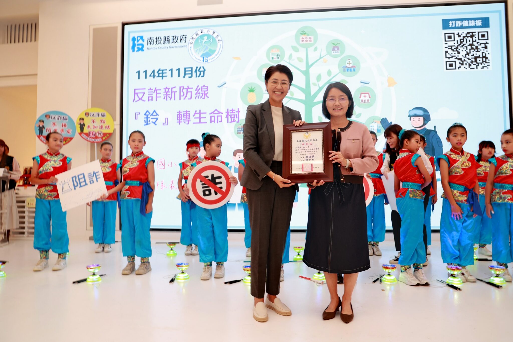 縣警局打詐記者會,邀請南投市嘉和國小表演花式扯鈴,也讓學生了解打詐的重要,知名藝人黑面出任南投縣反詐騙宣導大使,他用幽默的口吻,宣導民眾注意,不要被騙。