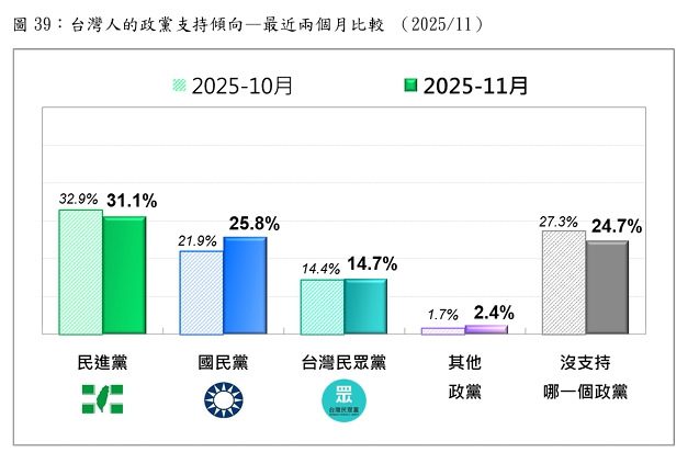 ​綜合報導/台灣民意基金會今天公布11月全台性民調,其中針對台灣人的政黨支持傾向,調查結果顯示,民進黨獲31.1%、中國國民黨25.8%、台灣民眾黨14.7%。與10月進行對比,民進黨支持度下滑1.8個百分點;國民黨上揚3.9個百分點,民眾黨略增0.3個百分點,中性選民下滑2.6個百分點。台灣民意基金會董事長游盈隆認為,如今藍白支持度相加已超過綠9.4個百分點,這是一個嚴重的警訊。