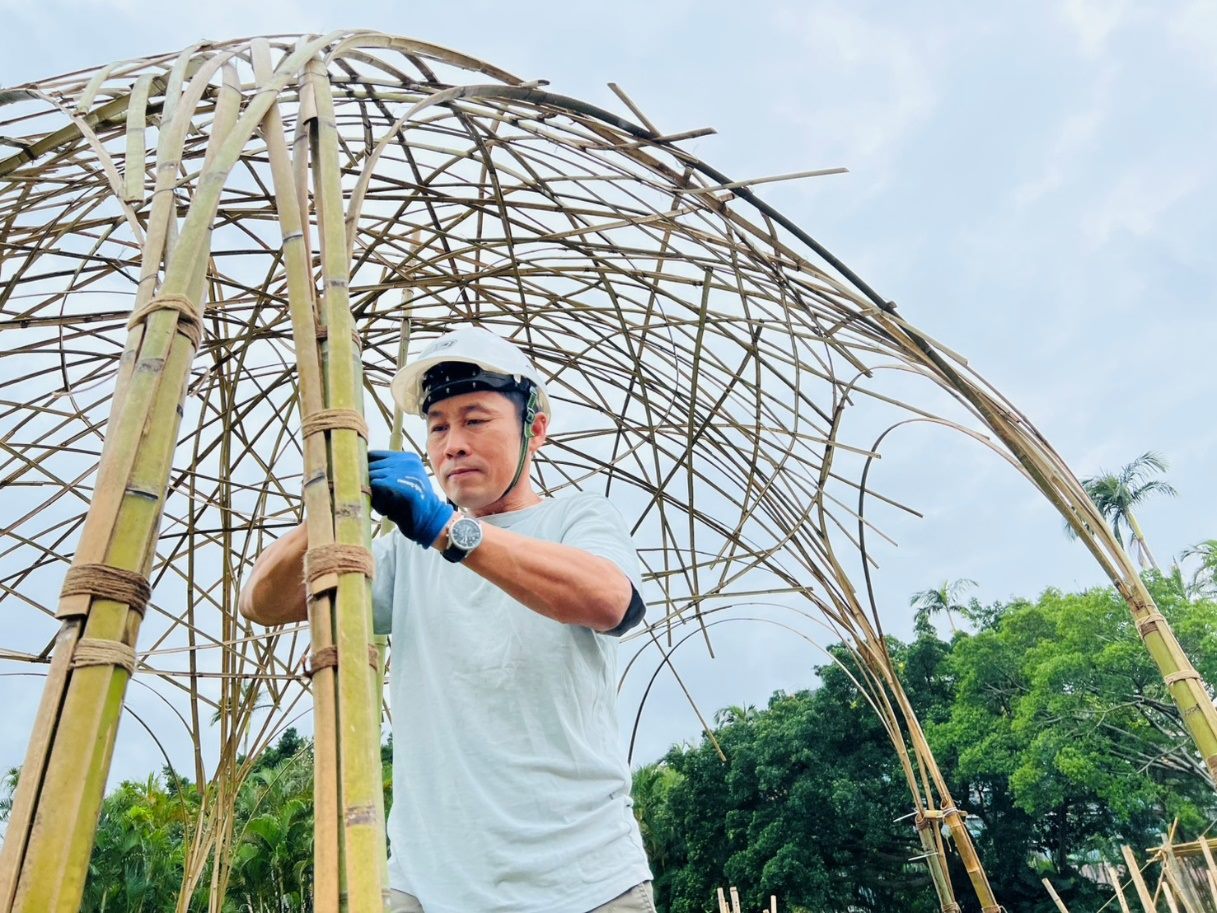 在中式庭園「幸福.憩家園」展區與藝術家小亨利共同創作竹構裝置「流光之巢」,竹材交織成溫暖穹頂,陽光從縫隙灑落,如鳥巢般象徵「夢想的起點」,周邊藤球、斗笠與菊科草花營造恬靜氛圍,讓人沉浸在緩慢舒心的鄉野氣息。