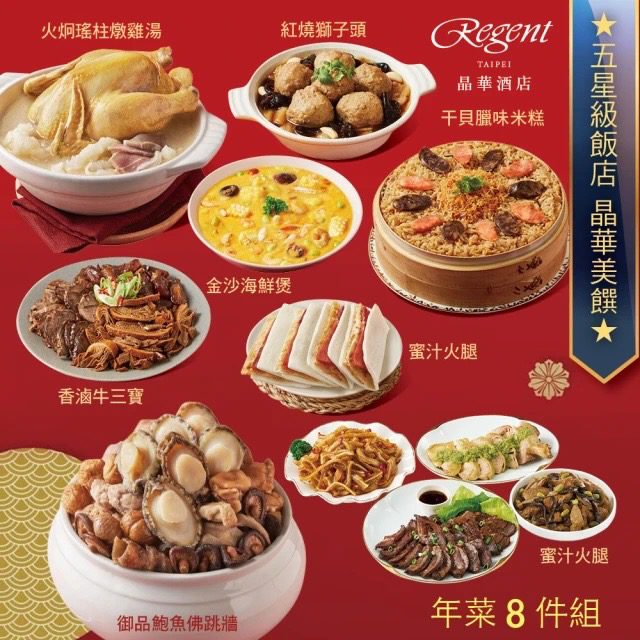 台北晶華酒店今年的年菜組合陣容澎湃,從有大顆鮑魚的「御品鮑魚佛跳牆」、加了花膠鮮甜濃郁的「火烔瑤柱燉雞湯」、細緻的「金沙海鮮羹」、今年新菜色有「紅燒獅子頭」與「蜜汁火腿」,主廚團隊以層層堆疊的湯底與火侯演繹「五星風味」的極致。冷盤、熱菜、湯羹與米糕組成完整桌席,華麗排場中藏著家的味道。往年總是提前一個月售完,一年一次的新春家宴,完整菜單要提早打理唷!