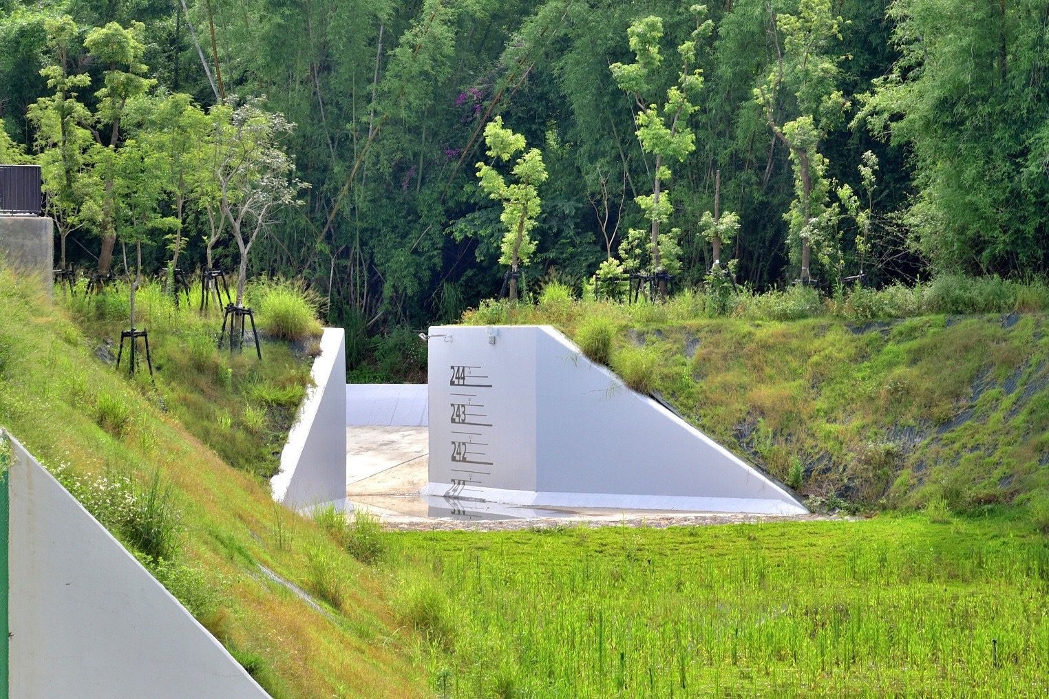 此外,「旱溝排水綠10-2溪畔景觀池」,為提升后里地區防洪安全,同時兼顧休憩及生態機能,打造面積約1.06公頃的生態滯洪池,因位屬石虎重要棲地,特別納入生態保育考量,營造適合動植物棲息處所,尤其通過前陣子梅雨鋒面過境的強降雨考驗,易淹區域已無淹水情形,成功發揮滯洪減災功效。
