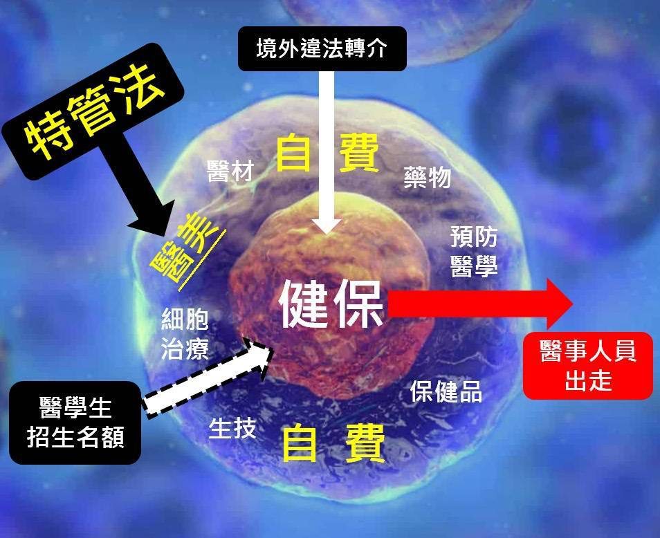 如同細胞一樣,以健保為核心的醫療生技,如果任由病毒,自由基破壞(不利的法規和違法行為),健保‘’細胞‘’將被擊穿,持續崩壞。圖/六大醫學會聯合提供