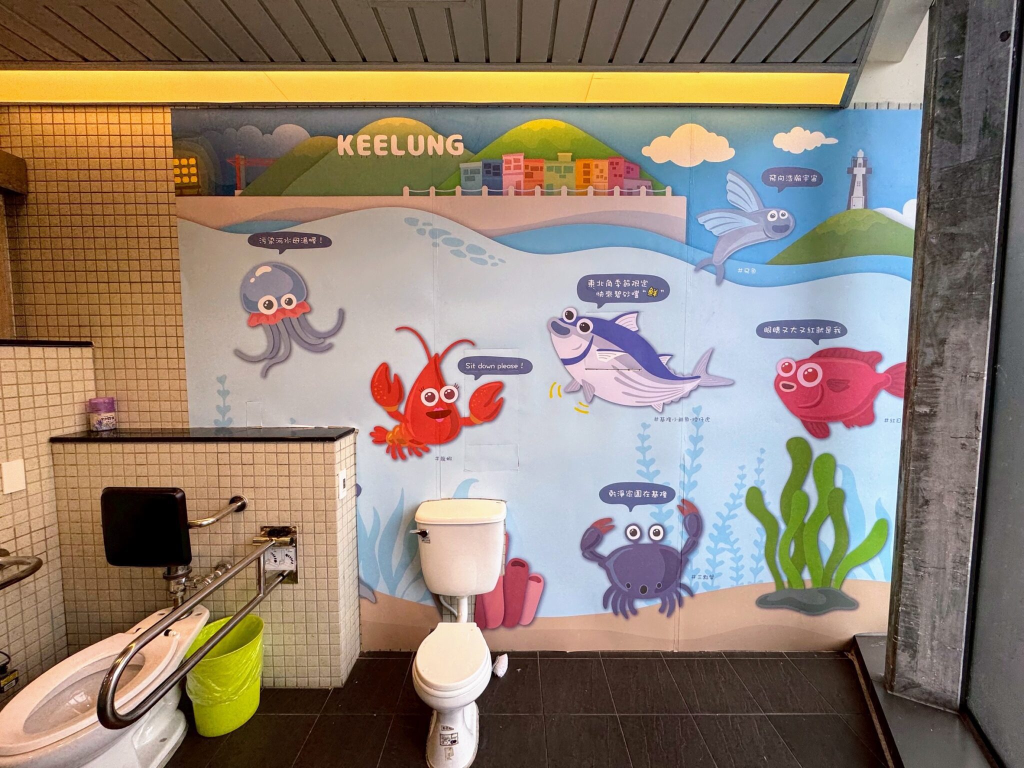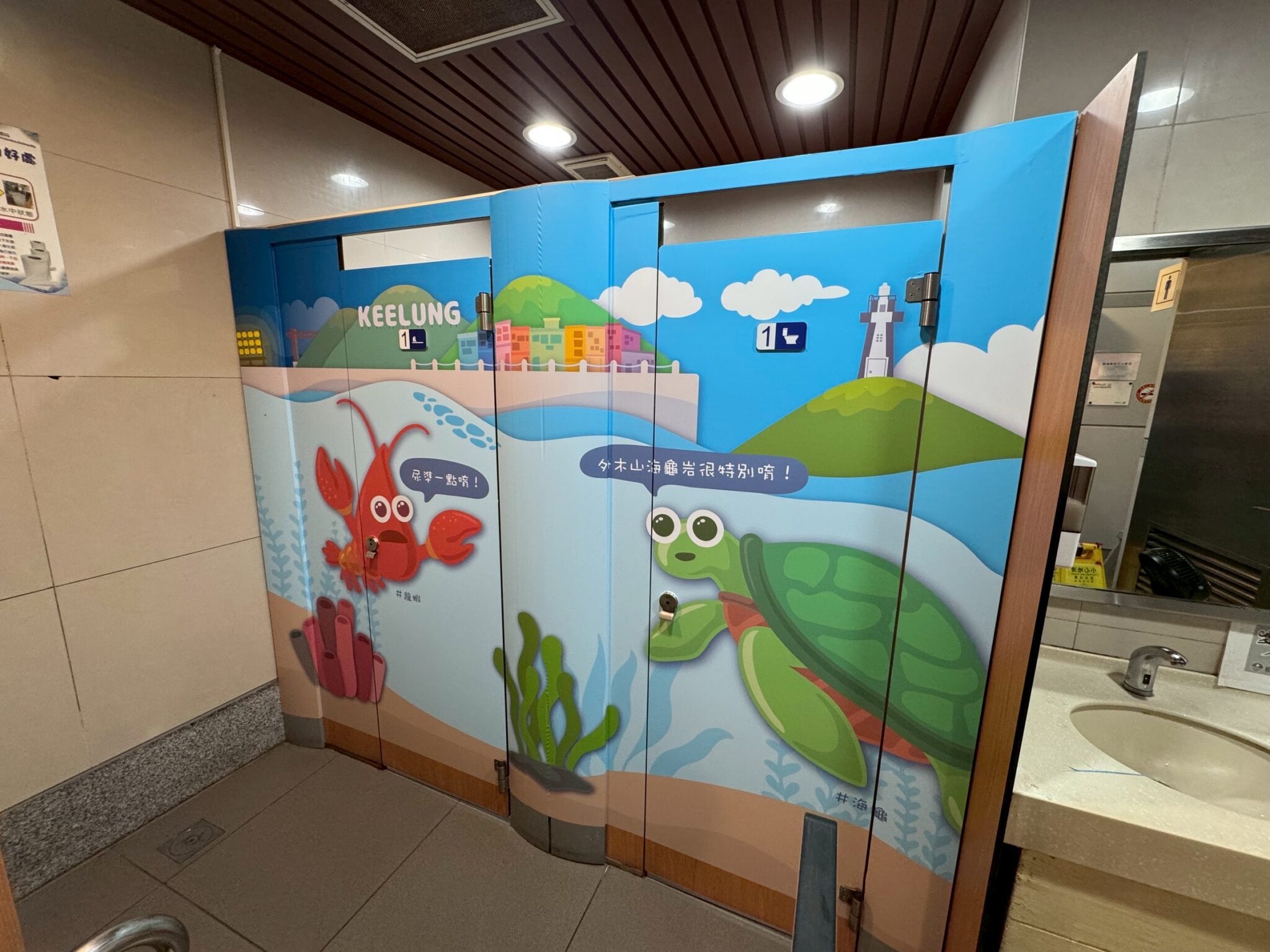 基隆擁有豐富的港灣景致與深厚的人文底蘊,本次設計以「海洋生物」及「基隆人文特色」為創作主軸,選用具有指標性的基隆市魚黑鯛、基隆小鮪魚(煙仔虎),以及代表基隆季節性漁獲的鎖管為主要角色,並加入龍蝦、三點蟹、鳳螺、九孔、海龜、白鯧、紅目鰱、飛魚、白帶魚、胭脂蝦、馬頭魚、剝皮魚、水母、軟絲等在地海洋生物。整體圖像以擬人化、活潑的畫風呈現,搭配詼諧有趣的標語,並結合基隆地標建築與廟口夜市街景等人文特色,呈現出「海洋城市的熱情」與「有愛城市的人情」,讓公廁成為認識基隆的一扇窗口。