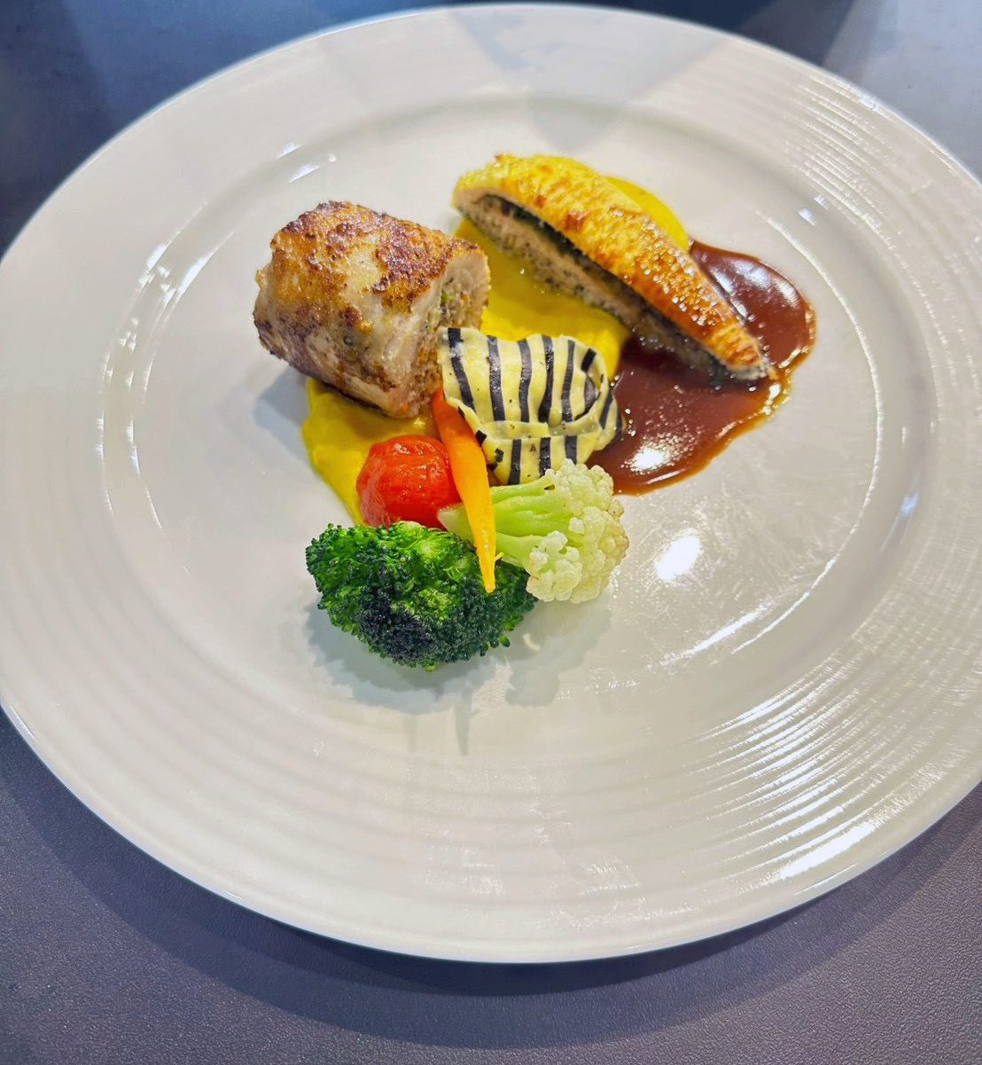 林科任以最能襯托松露香氣的雞肉為發想主軸,巧妙運用雞胸與雞腿兩種不同質地的部位,呈現出層次豐富的作品,成功獲得評審青睞,拿下「西式松露」項目銀牌。他表示,比賽不是比誰技術好,而是能在壓力下保持穩定狀態。在賽場上,看見來自世界各地選手大氣的盤式、乾淨的技法與獨特的風味,深感自己的不足之處,也堅定持續提升的決心。
