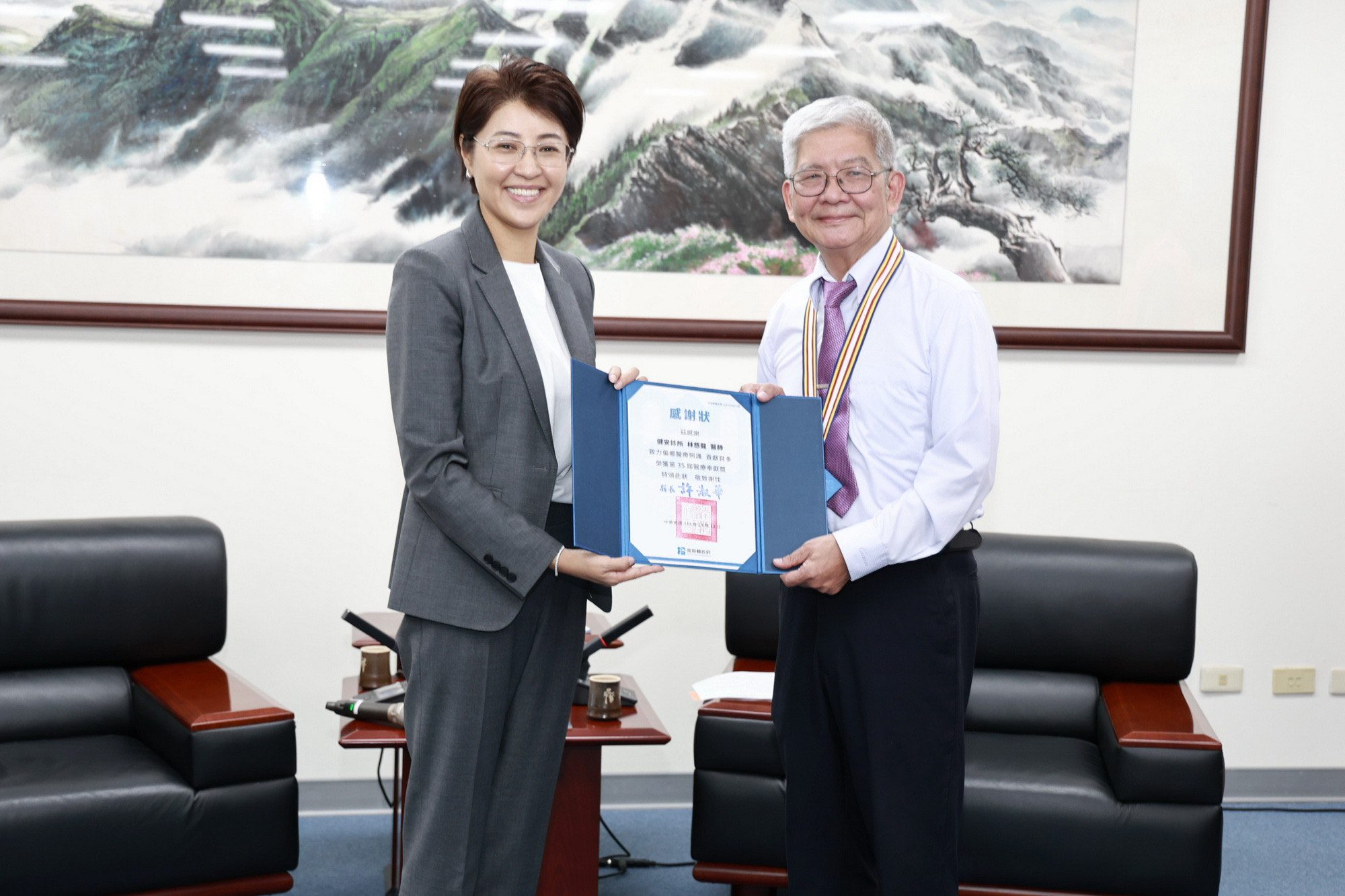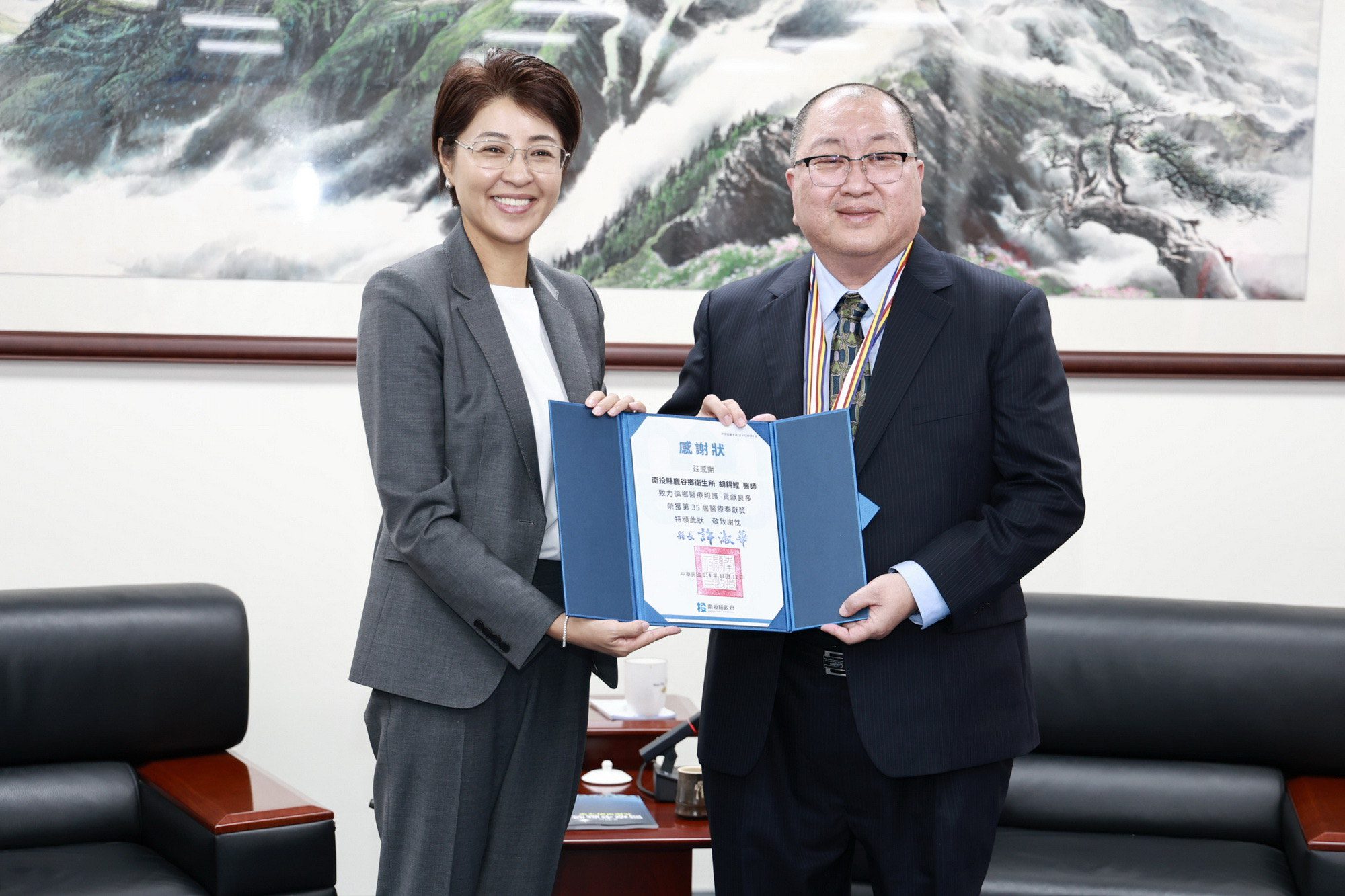南投縣埔里基督教醫院賴力行、仁愛鄉健安診所林慈龍、鹿谷鄉衛生所主任胡錫鰹等3位醫師,榮獲第35屆「醫療奉獻獎」殊榮,縣長許淑華25日於縣長室親自接見,並致贈感謝狀與紀念品給三位醫師,感謝醫師們長年深耕偏鄉,守護縣民健康,展現醫者仁心的信念與價值,讓人感受到南投最溫暖的力量。
