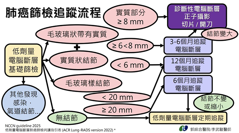 當結節被發現後,多數情況下並不需要立即處理,而是依照國際指引採行定期追蹤。結節的大小、實質成分比例、是否增大,會決定追蹤的頻率,從三個月至一年不等。若結節顯示高度惡性特徵,便會進一步安排正子攝影、切片或手術,以確定診斷。