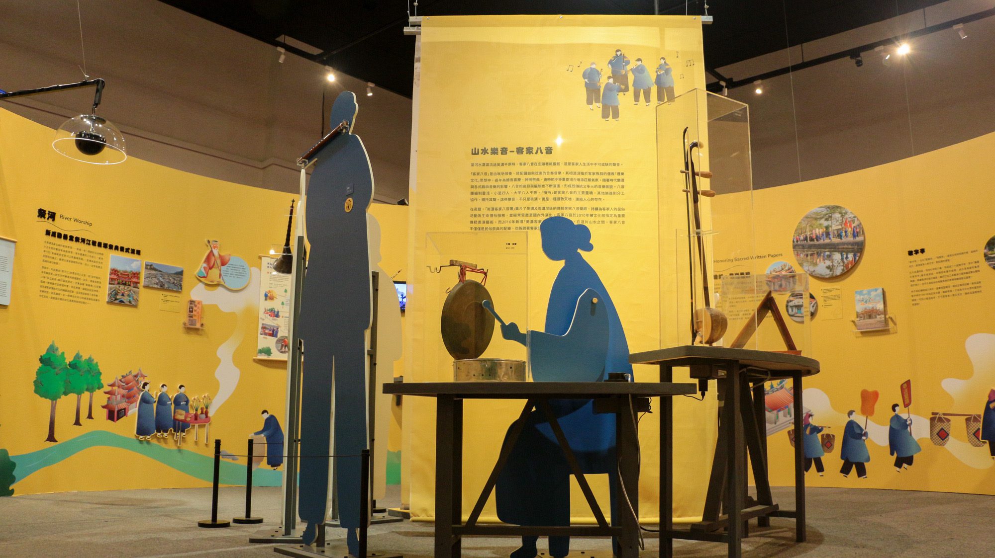 高屏溪特展以蜿蜒的流向曲面規劃「溪水流過人間」、「神靈與子民共棲之地」、「敬天祭河送字灰」、「勇魂與守護神」四大展區,帶領觀眾從上游到出海口,透過故事、文物、影像、模型等,探索人與水、土地與信仰之間川流不息的連結。