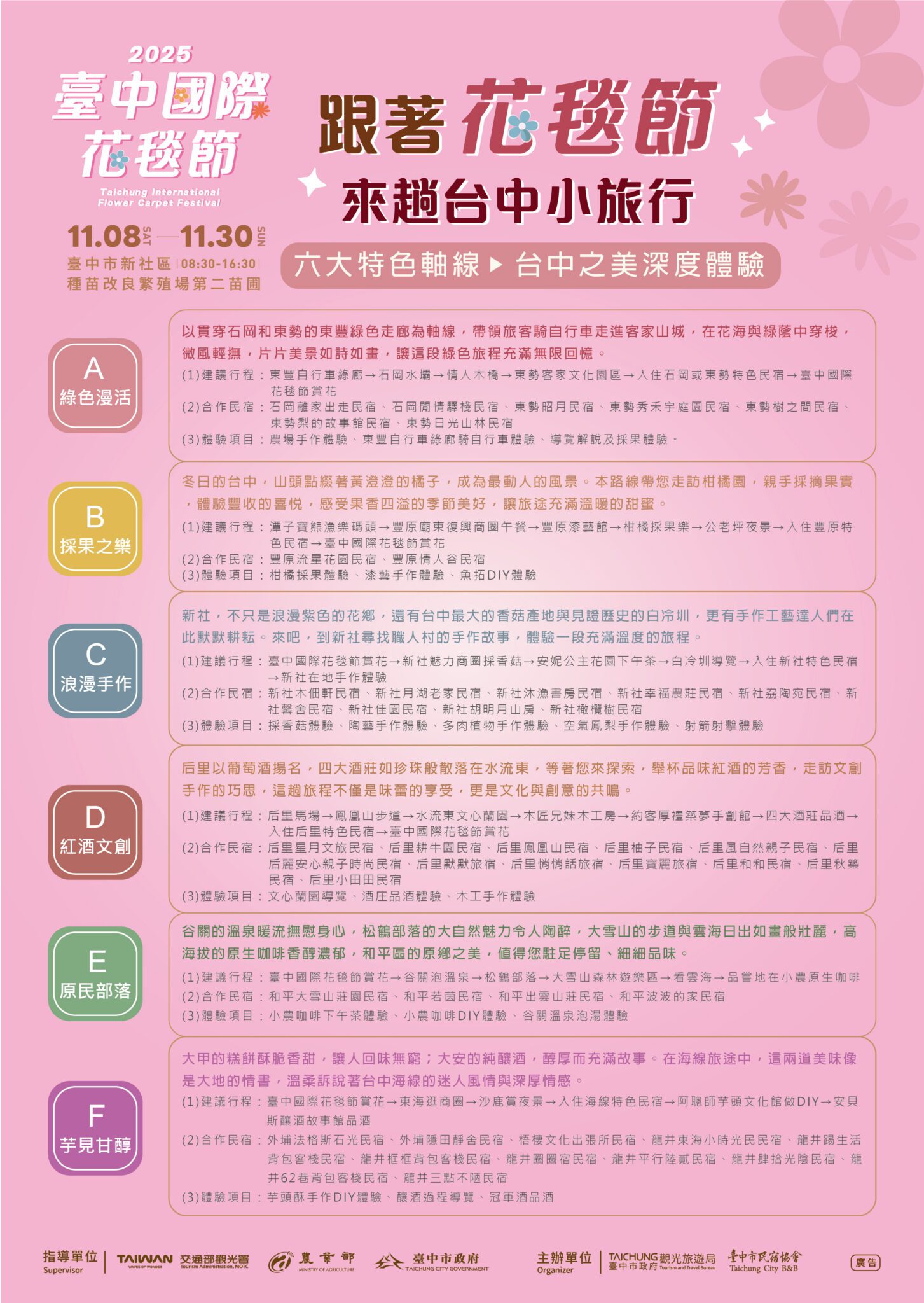 今年台中國際花毯節特別以知名卡通頻道「飛天小女警」為設計靈感,全新打造絕美花毯,以繽紛色彩與童趣造景,呈現夢幻花卉盛宴。新社是台中市內最多民宿申設的轄區,逛完花毯節先別急著回家,不妨選擇在充滿田園氣息的民宿留宿一晚,今年觀旅局與台中市民宿協會及MITSUI OUTLET PARK台中港合作,花毯節期間入住山城及海線民宿即享優惠活動,不僅可至合作店家體驗手作等優惠,並可持MITSUI OUTLET PARK台中港當日不限金額消費發票或銷貨明細,兌換「保溫購物袋 & 店舗超值優惠券」乙份。(限量200份/不累贈)。更多的訊息可至「大玩台中」臉書粉絲團( https://www.facebook.com/taichungresort/?locale=zh_TW )、「台中觀光旅遊網」( https://travel.taichung.gov.tw/zh-tw )或「台中國際花毯節官網」( https://www.flowercarpet.tw/ )查詢。