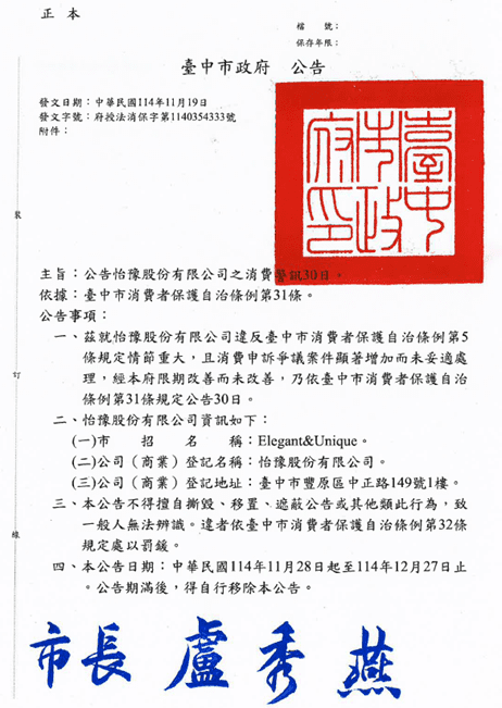 位於台中市豐原區中正路149號之怡豫股份有限公司(店招:Elegant&Unique,下稱怡豫公司),因近來消費申訴案件數量顯著增加,且屢次違反《消費者保護法》第18條及台中市《消費者保護自治條例》第5條規定,經衛生局裁罰後仍未改善。台中市政府法制局長李善植表示,台中市113年修正公布台中市消費者保護自治條例,首創政府機關可前往業者營業場址張貼消費警訊告示之機制。新法上路後,市府審酌怡豫公司違規情節及消費申訴案件顯著增加的狀況,由市府消保官及衛生局等單位於其營業場所張貼公告,業者自114年11月28日至同年12月27日,不得撕毀、移置、遮蔽或有其他致一般人無法辨識該公告之行為;期能提醒消費者慎選店家、謹慎消費。
