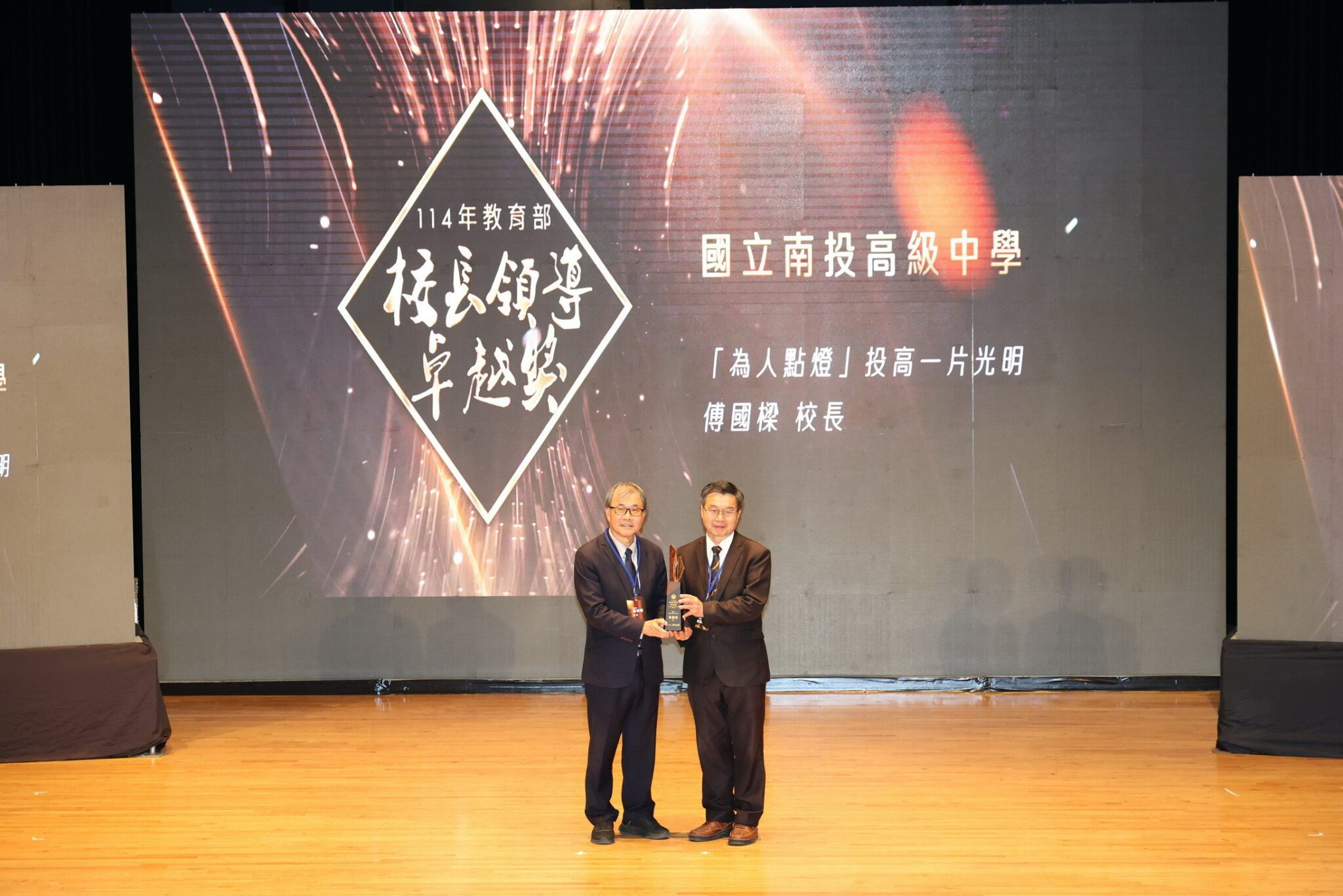 「114年度教育部校長領導卓越獎暨教學卓越獎頒獎典禮」28日下午在南投縣文化局演藝廳隆重登場,各項角逐競爭激烈,展現教育團隊的多元創新與專業成長。教育部長鄭英耀與南投縣副縣長王瑞德到場祝賀及頒獎,過程隆重。