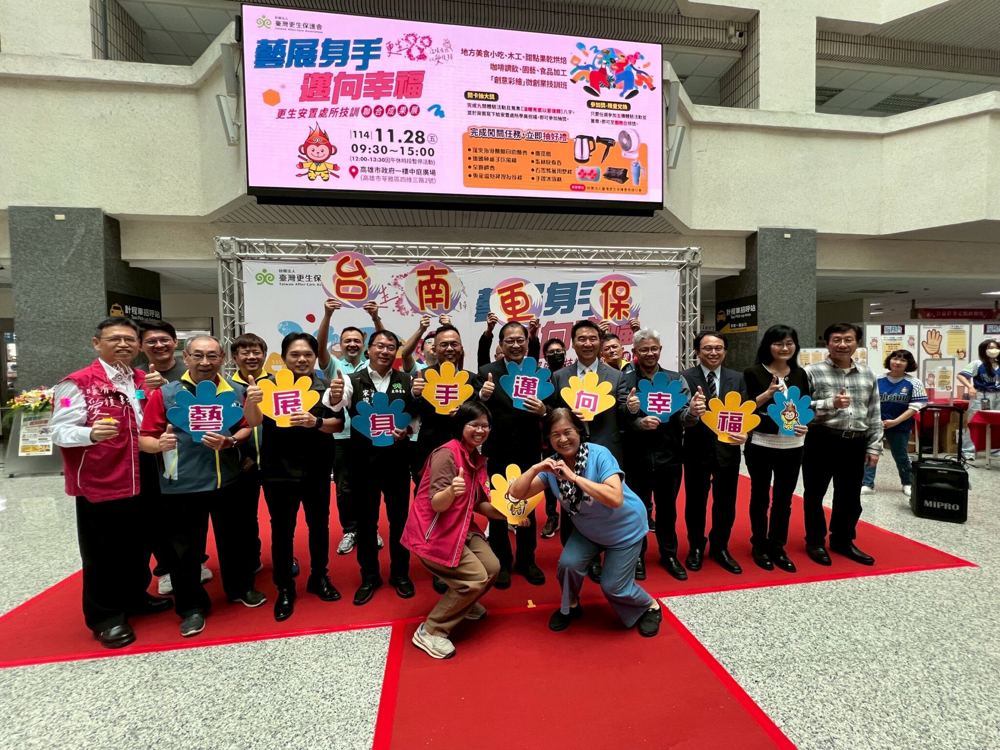 高雄市政府一樓中庭今日湧現熱烈人潮。由 臺灣更生保護會高雄分會主辦的「藝展身手・邁向幸福」更生人技訓成果展正式登場,全國地檢署檢察長、矯正署主管、法務部長皆到場支持,象徵更生保護推動 80 年來的重要里程碑。