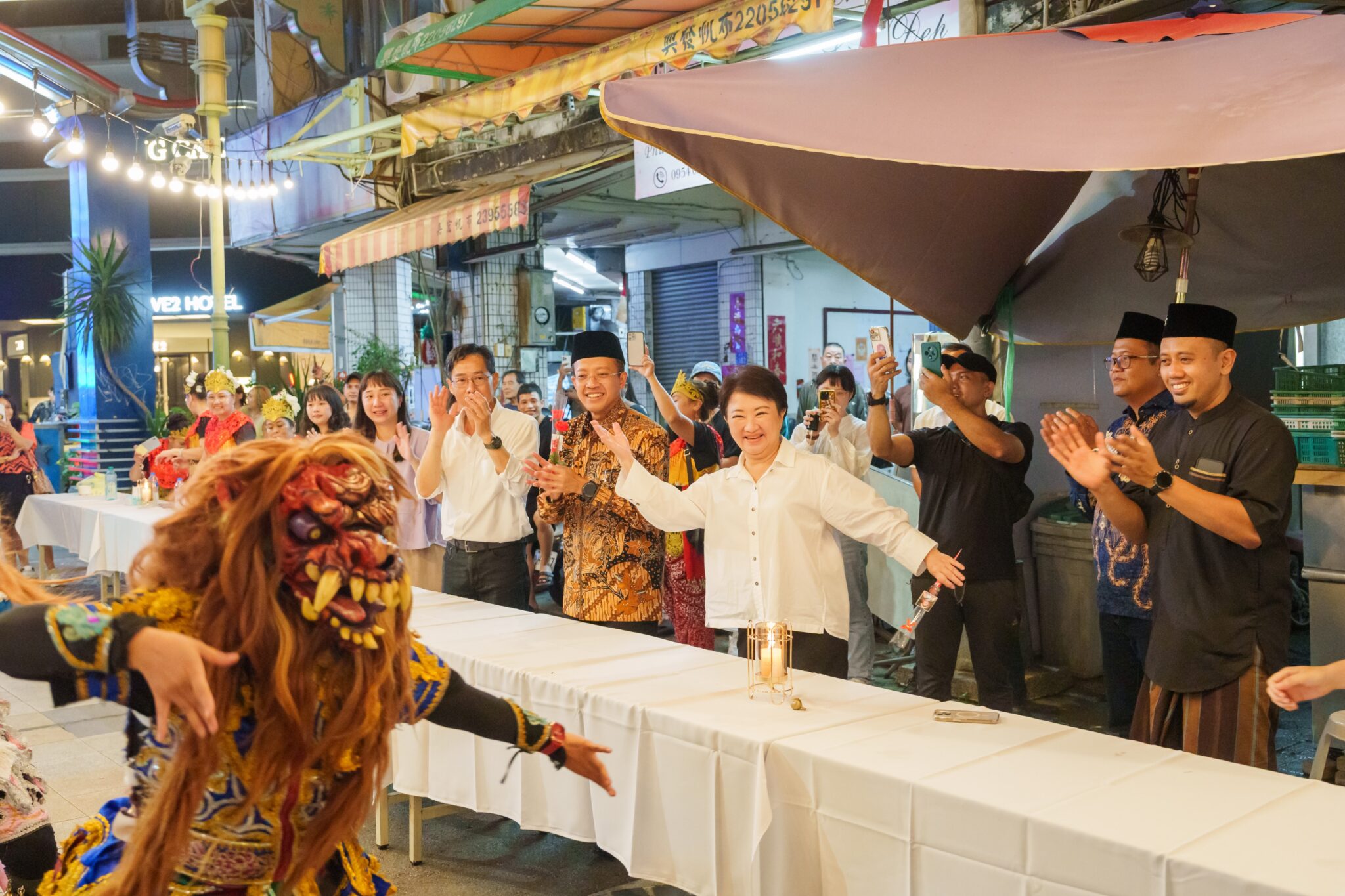 傍晚,行程來到鄰近的繼光街,現場特別布置為初秋夜色中的南洋美食盛宴,椰香、香料香與油炸香氣四溢,道地印尼料理一字排開,色彩與風味吸睛迷人。市長盧秀燕與代表艾吏福共同在象徵祝福的薑黃祈福塔飯前揭開晚會序幕。伴隨家鄉歌曲與東南亞商家市集氣氛,由移工組成的舞團更帶來峇厘島傳統舞劇──巴龍舞(Barong Dance),融合印度教、佛教與馬來文化的神話色彩,讓現場宛如置身峇厘島。盧市長、代表與印尼朋友一起搖擺共舞,使繼光街成為最熱情的「一日峇厘島」。