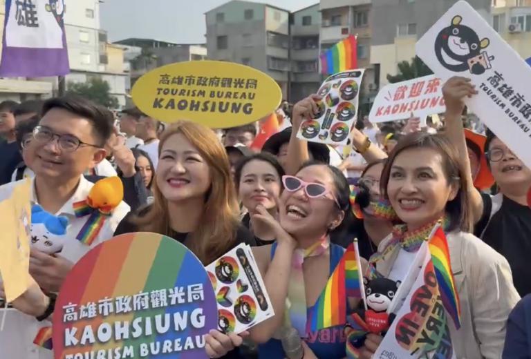 ▲同遊現場民眾手舉「換同志挺高雄贏」手舉牌吸睛。(圖/高婕翻拍)